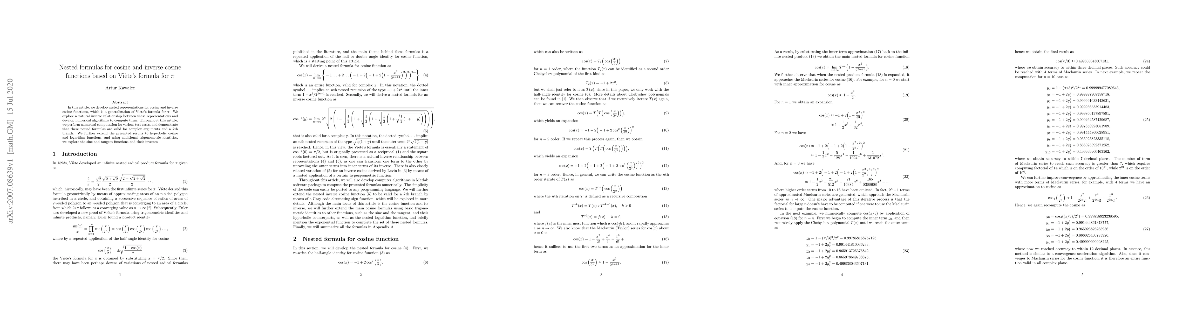 This paper develops nested formulas for cosine and inverse cosine functions based on Viète's formula for π, exploring their inverse relationships and numerical algorithms. It extends these results to hyperbolic cosine and logarithm functions, and uses trigonometric identities to investigate sine, tangent, and their inverses.