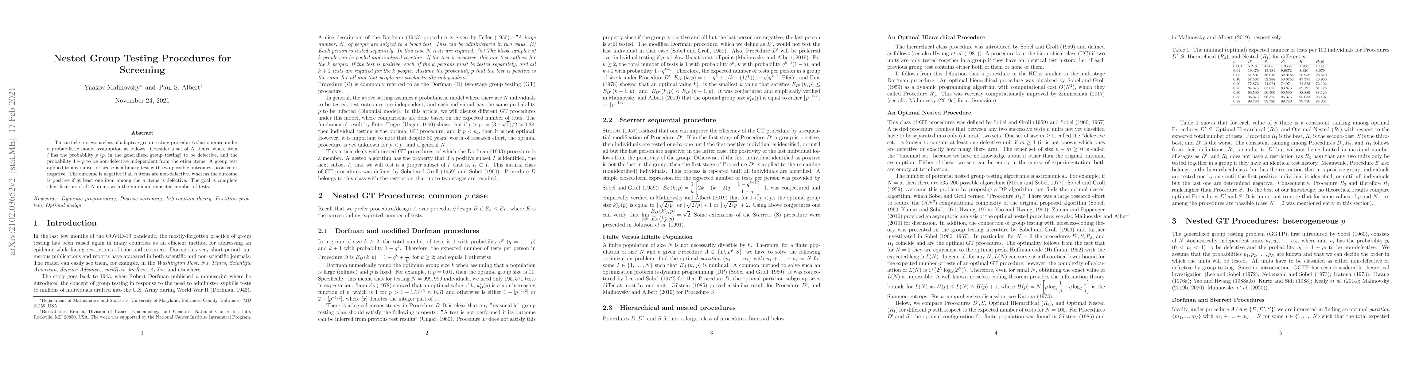 This article reviews a class of adaptive group testing procedures that operate under a probabilistic model assumption as follows. Consider a set of $N$ items, where item $i$ has the probability $p$ ($p_i$ in the generalized group testing) to be defective, and the probability $1-p$ to be non-defective independent from the other items. A group test applied to any subset of size $n$ is a binary test with two possible outcomes, positive or negative. The outcome is negative if all $n$ items are non-defective, whereas the outcome is positive if at least one item among the $n$ items is defective. The goal is complete identification of all $N$ items with the minimum expected number of tests.