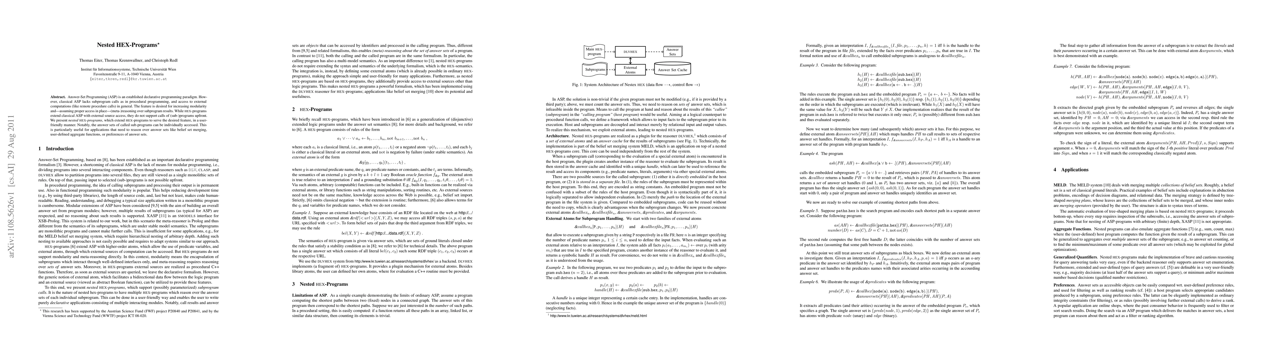 Nested HEX-programs extend HEX-programs to incorporate subprogram calls and external computation access, allowing for modularity and meta-reasoning over subprogram results, with individual answer sets of called sub-programs accessible for applications requiring such reasoning.