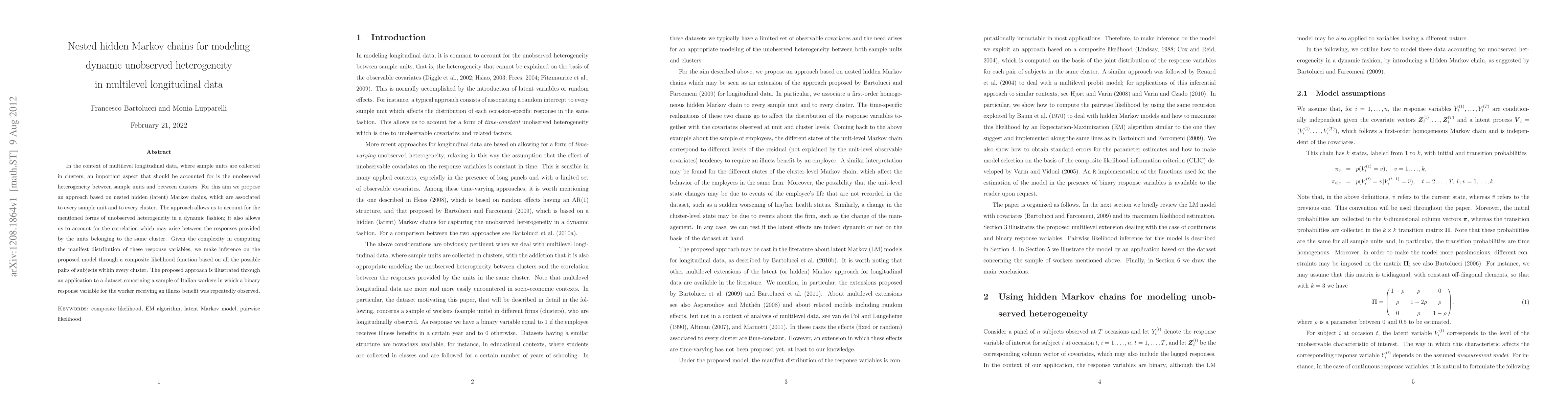 This paper proposes a nested hidden Markov chain model to account for dynamic unobserved heterogeneity in multilevel longitudinal data, addressing both individual and cluster-level variability. The approach uses a composite likelihood function for inference, demonstrated through an application analyzing Italian workers' illness benefit claims.