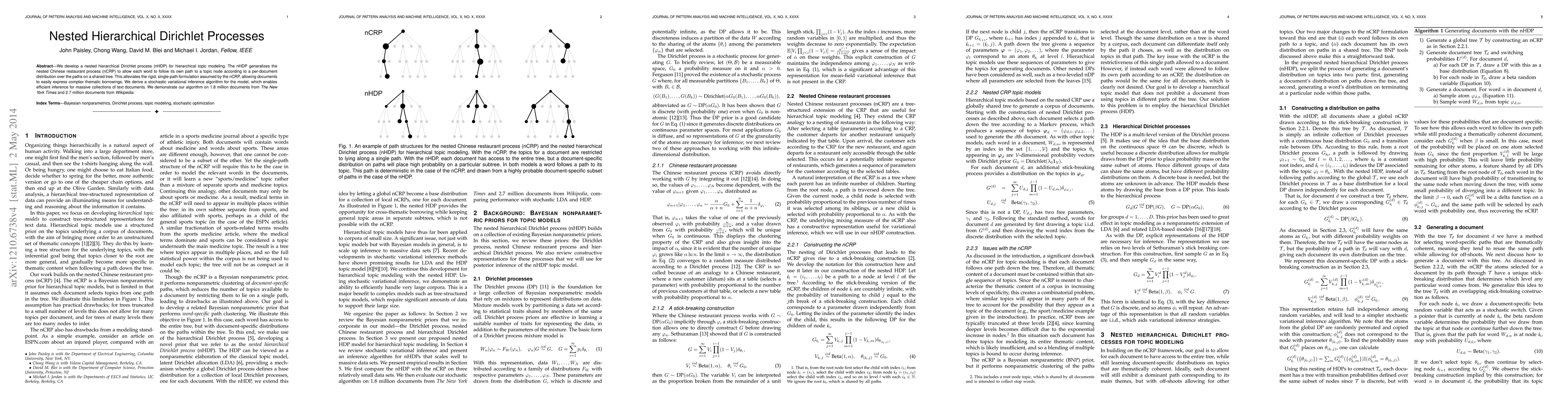 This research introduces a nested hierarchical Dirichlet process (nHDP) for advanced hierarchical topic modeling, offering a flexible alternative to the nested Chinese restaurant process (nCRP). The nHDP allows for more nuanced thematic exploration by permitting each word to follow a unique path to a topic node, based on document-specific distributions. The study also presents a stochastic variational inference algorithm and a greedy subtree selection method for efficient inference, demonstrated through analysis of large text corpora from The New York Times and Wikipedia. For detailed insights, please refer to the original paper.