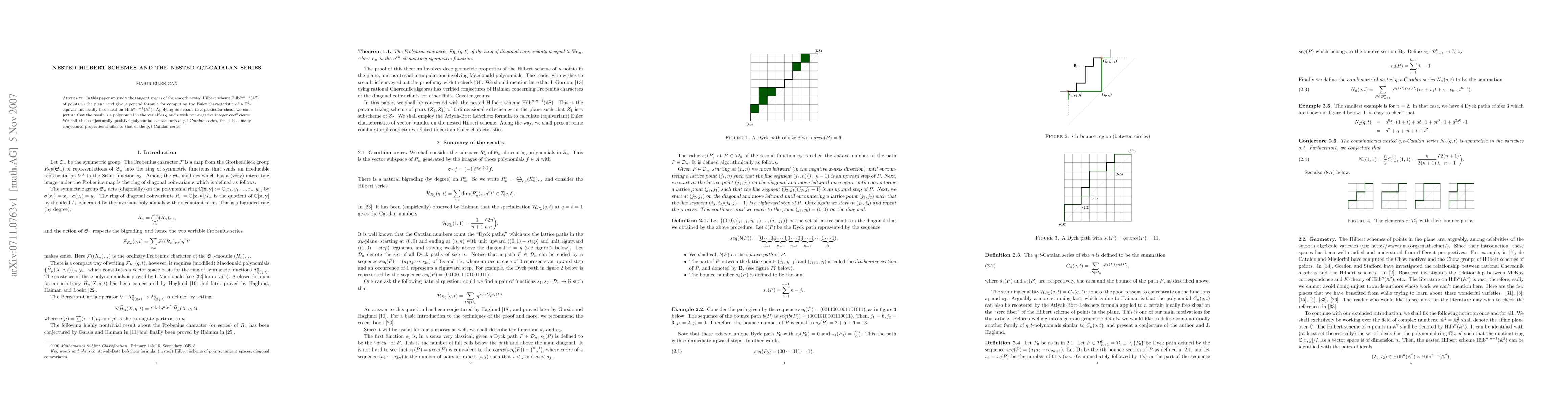 In this paper we study the tangent spaces of the smooth nested Hilbert scheme $ Hil{n,n-1}$ of points in the plane, and give a general formula for computing the Euler characteristic of a $\TT^2$-equivariant locally free sheaf on $\Hil{n,n-1}$. Applying our result to a particular sheaf, we conjecture that the result is a polynomial in the variables $q$ and $t$ with non-negative integer coefficients . We call this conjecturally positive polynomial as \textsl{the nested $q,t$-Cat alan series}, for it has many conjectural properties similar to that of the $q,t $-Catalan series.