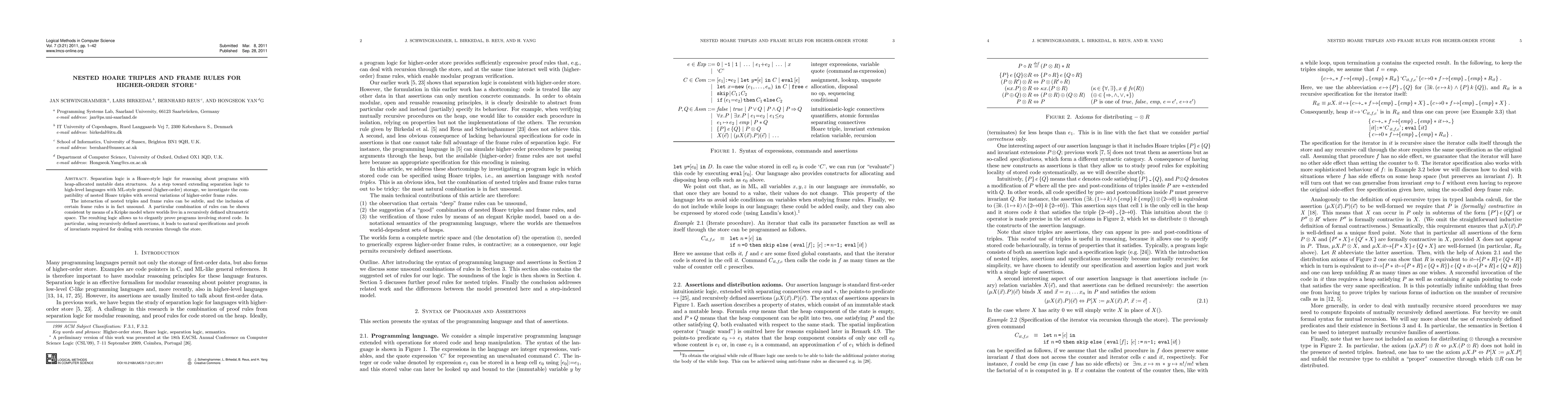 This paper extends separation logic to higher-order languages by exploring the compatibility of nested Hoare triples with frame rules, proving that a specific combination remains sound using a Kripke model, and demonstrating its utility in proving invariants for programs involving stored code and recursion.