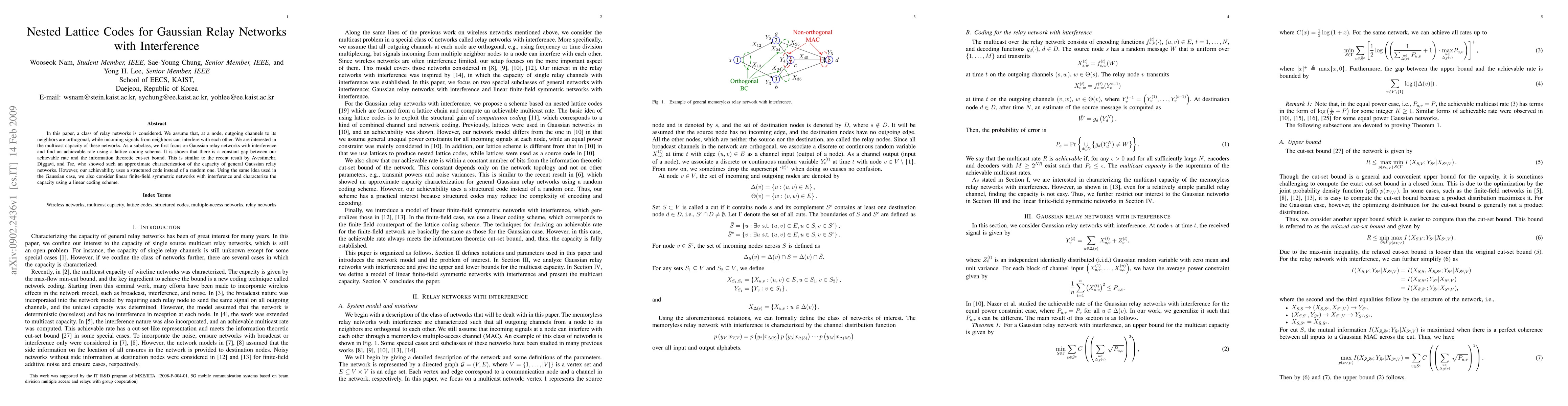This paper explores nested lattice codes for Gaussian relay networks where interference occurs on incoming signals. The authors achieve a rate close to the information-theoretic cut-set bound using a structured lattice coding scheme, demonstrating a constant gap similar to recent results for general Gaussian relay networks. They extend this approach to linear finite-field symmetric networks.