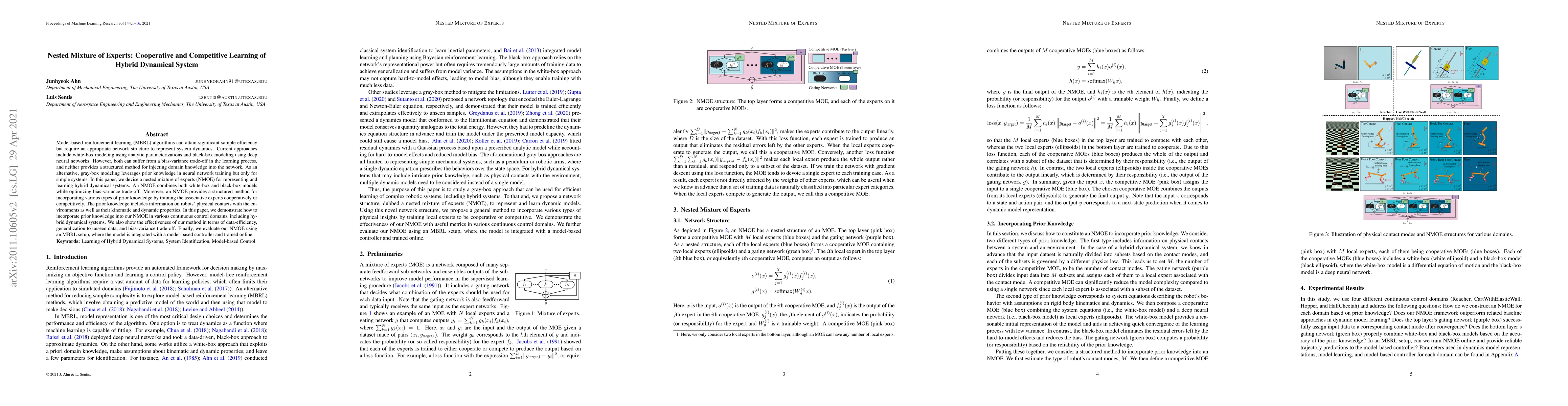 Model-based reinforcement learning (MBRL) algorithms can attain significant sample efficiency but require an appropriate network structure to represent system dynamics. Current approaches include white-box modeling using analytic parameterizations and black-box modeling using deep neural networks. However, both can suffer from a bias-variance trade-off in the learning process, and neither provides a structured method for injecting domain knowledge into the network. As an alternative, gray-box modeling leverages prior knowledge in neural network training but only for simple systems. In this paper, we devise a nested mixture of experts (NMOE) for representing and learning hybrid dynamical systems. An NMOE combines both white-box and black-box models while optimizing bias-variance trade-off. Moreover, an NMOE provides a structured method for incorporating various types of prior knowledge by training the associative experts cooperatively or competitively. The prior knowledge includes information on robots' physical contacts with the environments as well as their kinematic and dynamic properties. In this paper, we demonstrate how to incorporate prior knowledge into our NMOE in various continuous control domains, including hybrid dynamical systems. We also show the effectiveness of our method in terms of data-efficiency, generalization to unseen data, and bias-variance trade-off. Finally, we evaluate our NMOE using an MBRL setup, where the model is integrated with a model-based controller and trained online.
