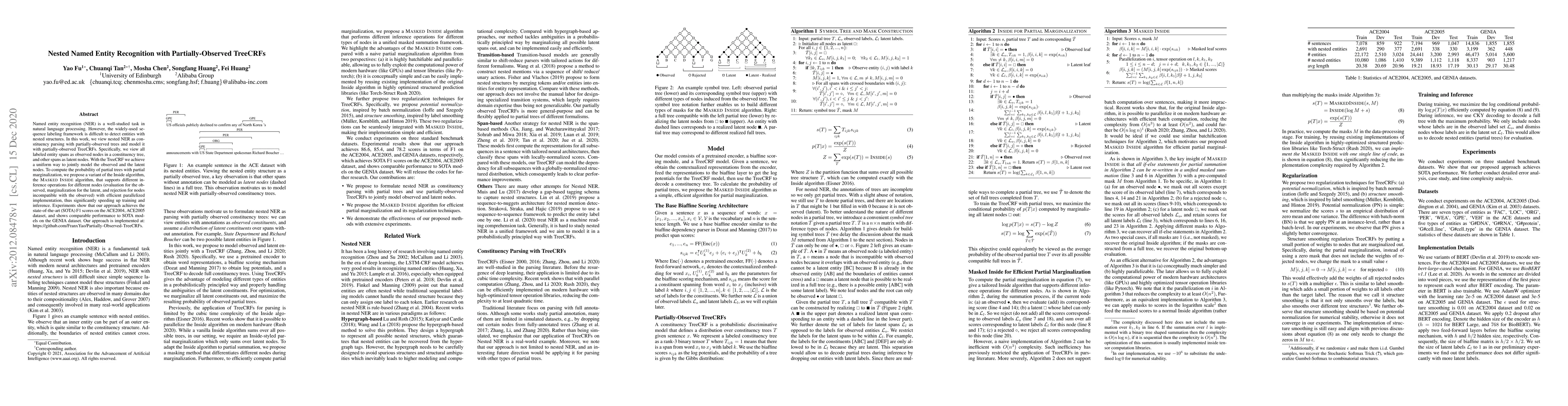 This paper proposes a novel approach to nested named entity recognition (NER) using partially-observed TreeCRFs, treating nested NER as constituency parsing with partially-observed trees. The Masked Inside algorithm enables efficient inference by handling different nodes (observed, latent, and incompatible) and achieves state-of-the-art performance on several datasets.