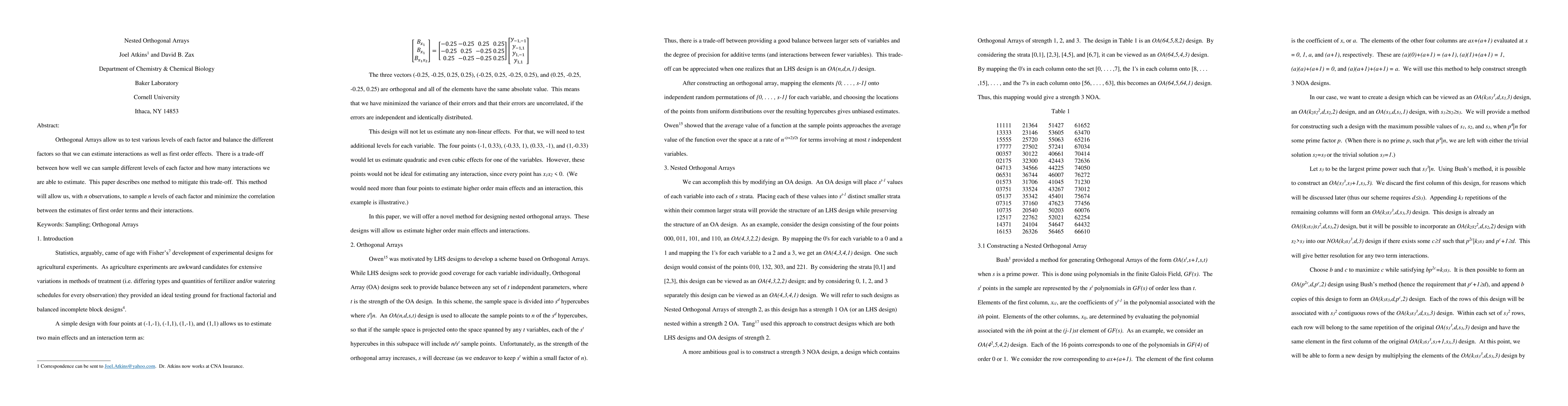 Nested Orthogonal Arrays allow for a balance between sampling different levels of factors and estimating interactions, minimizing correlation between first-order terms and their estimates.