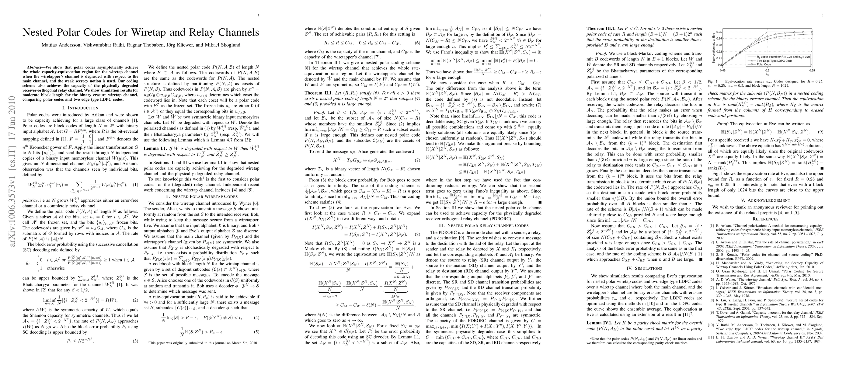 This paper demonstrates that nested polar codes can asymptotically achieve the entire capacity-equivocation region for wiretap channels under degraded wiretapper conditions and weak secrecy. It also achieves the capacity for the physically degraded receiver-orthogonal relay channel, with simulation results showing performance for moderate block lengths.
