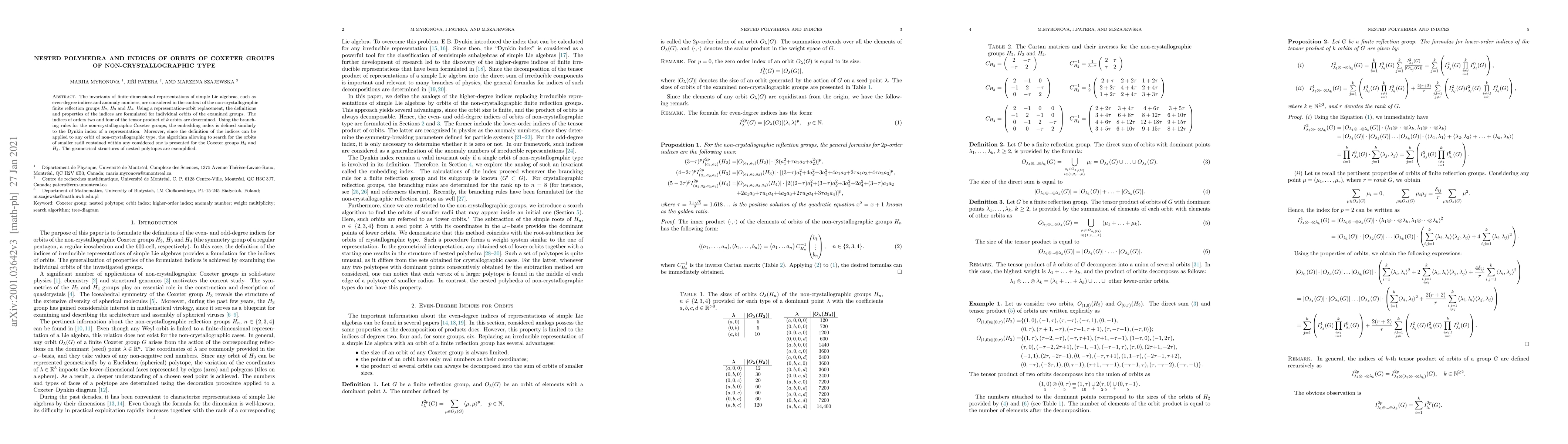 The invariants of finite-dimensional representations of simple Lie algebras, such as even-degree indices and anomaly numbers, are considered in the context of the non-crystallographic finite reflection groups $H_2$, $H_3$ and $H_4$. Using a representation-orbit replacement, the definitions and properties of the indices are formulated for individual orbits of the examined groups. The indices of orders two and four of the tensor product of $k$ orbits are determined. Using the branching rules for the non-crystallographic Coxeter groups, the embedding index is defined similarly to the Dynkin index of a representation. Moreover, since the definition of the indices can be applied to any orbit of non-crystallographic type, the algorithm allowing to search for the orbits of smaller radii contained within any considered one is presented for the Coxeter groups $H_2$ and $H_3$. The geometrical structures of nested polytopes are exemplified.