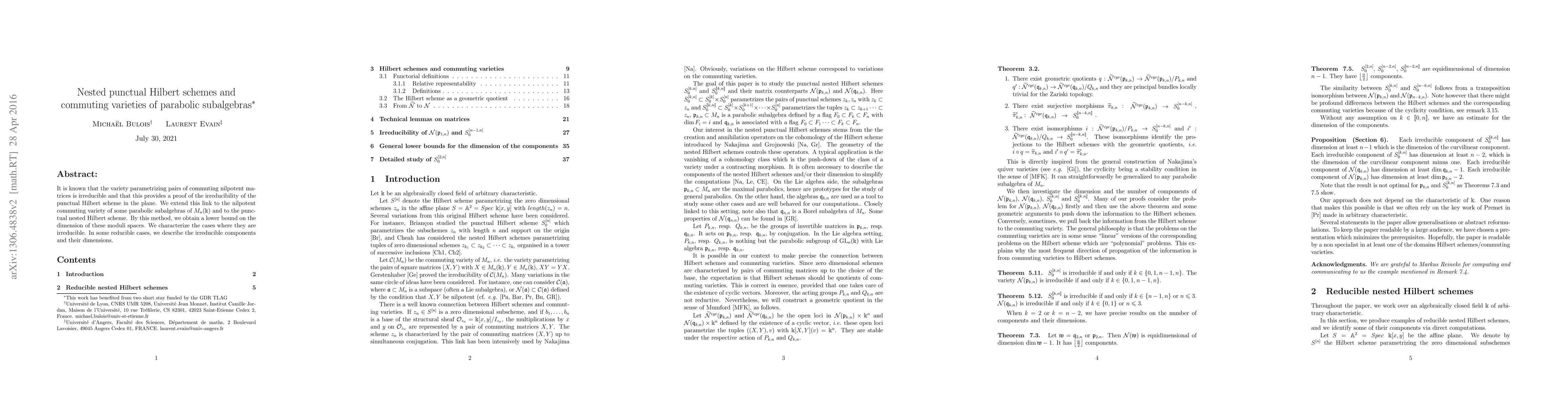 The paper explores the irreducibility and dimensions of nested punctual Hilbert schemes and commuting varieties of parabolic subalgebras of matrices, establishing lower bounds and characterizing conditions for irreducibility, and detailing irreducible components in reducible cases.