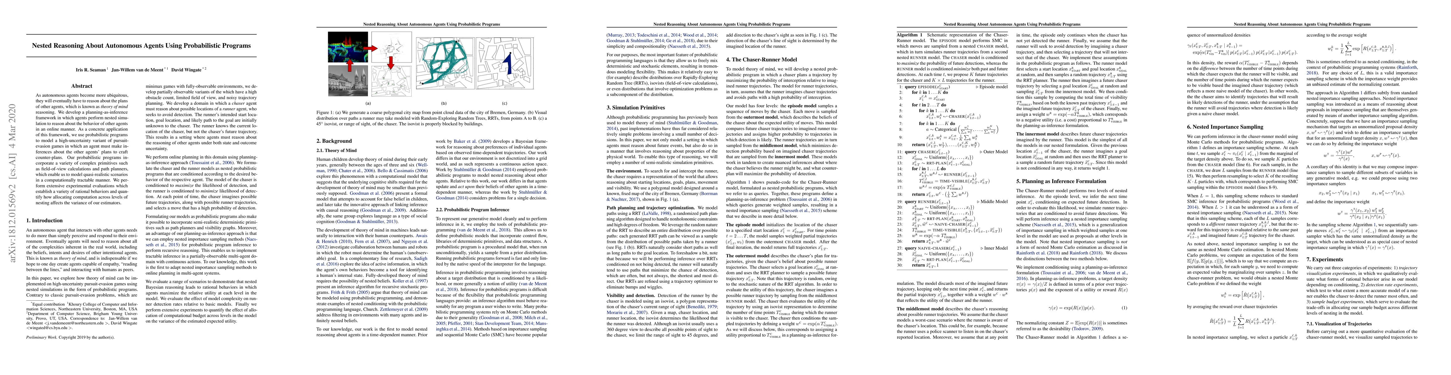 This paper presents a framework for autonomous agents to reason about each other's plans through nested simulation, using probabilistic programs to model pursuit-evasion games with high uncertainty. Experimental results show rational behaviors and analyze the impact of computation allocation on estimator variance.