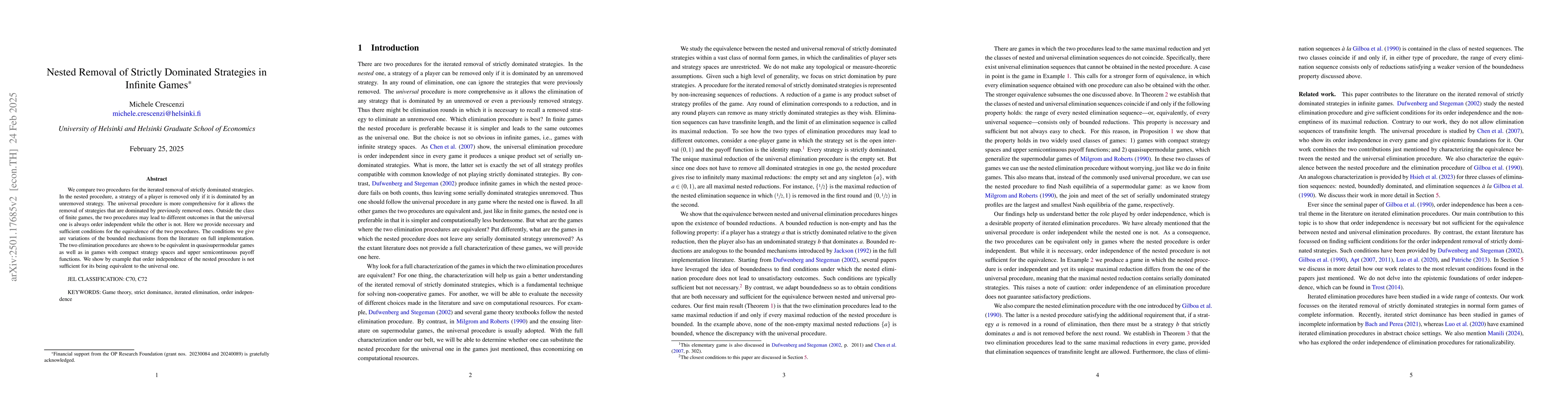 The paper examines two methods for removing strictly dominated strategies in infinite games: a nested procedure and a universal procedure. It establishes conditions under which these two methods yield equivalent results, showing they match in quasisupermodular games and those with compact strategy spaces and upper semicontinuous payoff functions.