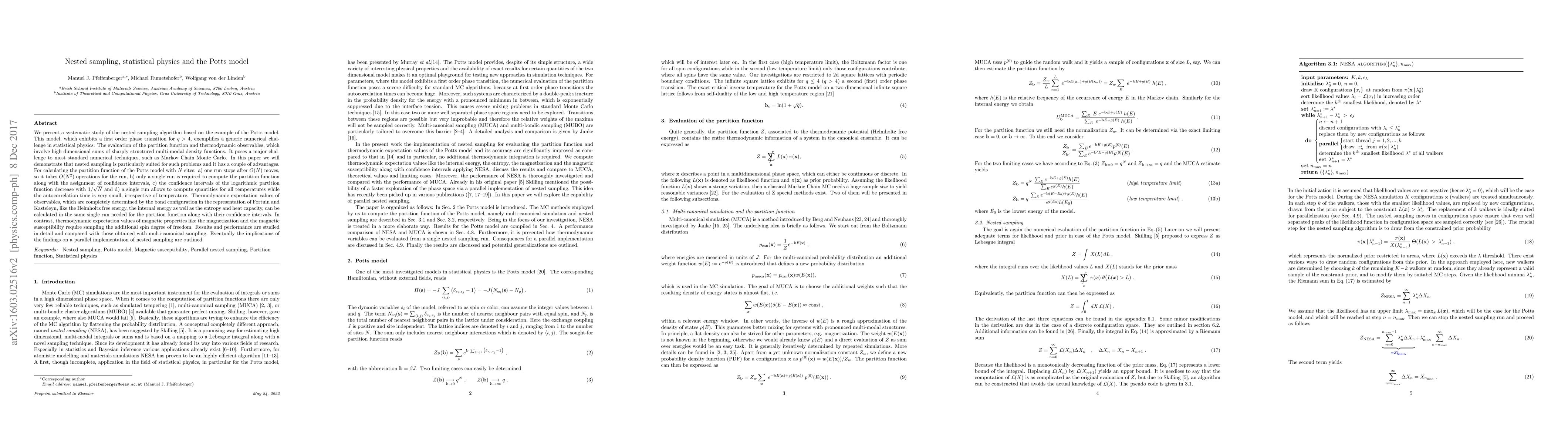 This paper investigates the nested sampling algorithm applied to the Potts model, demonstrating its effectiveness for evaluating partition functions and thermodynamic observables in high-dimensional, multi-modal density functions. The study shows that nested sampling requires fewer operations and provides accurate confidence intervals, making it superior to multi-canonical sampling for these complex statistical physics problems.