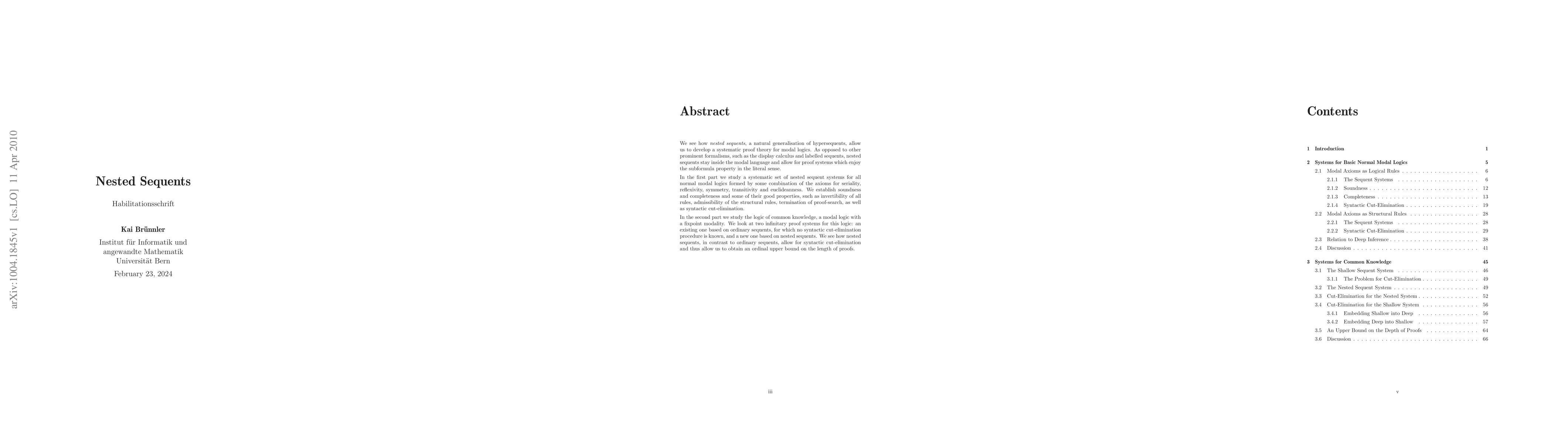 Nested sequents provide a systematic proof theory for modal logics, demonstrating soundness, completeness, and the subformula property. This approach facilitates the study of normal modal logics and the logic of common knowledge, allowing syntactic cut-elimination and establishing an ordinal upper bound on proof lengths.