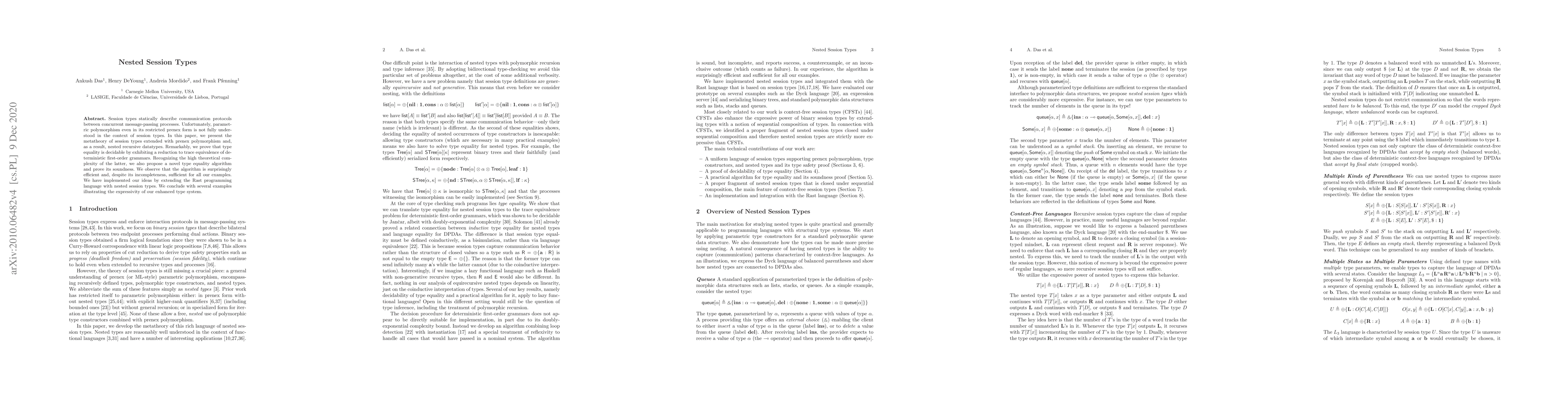 This paper extends the metatheory of session types to include prenex polymorphism, enabling nested recursive datatypes. It proves type equality decidability via reduction to trace equivalence of deterministic first-order grammars, proposing a novel efficient algorithm for type checking, and demonstrates its application through an extension to the Rast programming language.