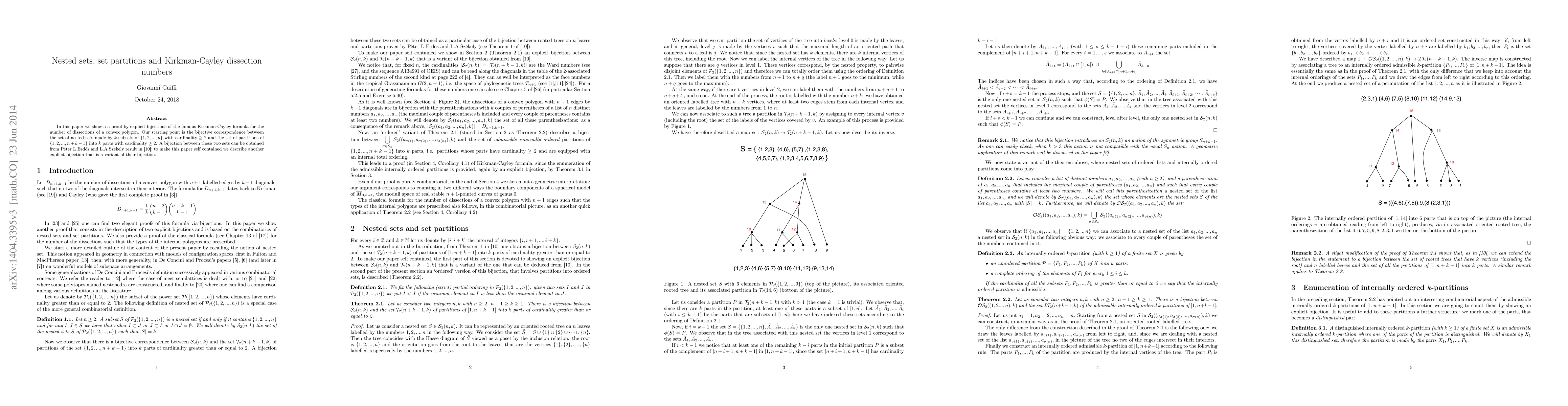 In this paper we show a a proof by explicit bijections of the famous Kirkman-Cayley formula for the number of dissections of a convex polygon. Our starting point is the bijective correspondence between the set of nested sets made by \(k\) subsets of \(\{1,2,...,n\}\) with cardinality \(\geq 2\) and the set of partitions of \(\{1,2,...,n+k-1\}\) into \(k\) parts with cardinality \(\geq 2\).