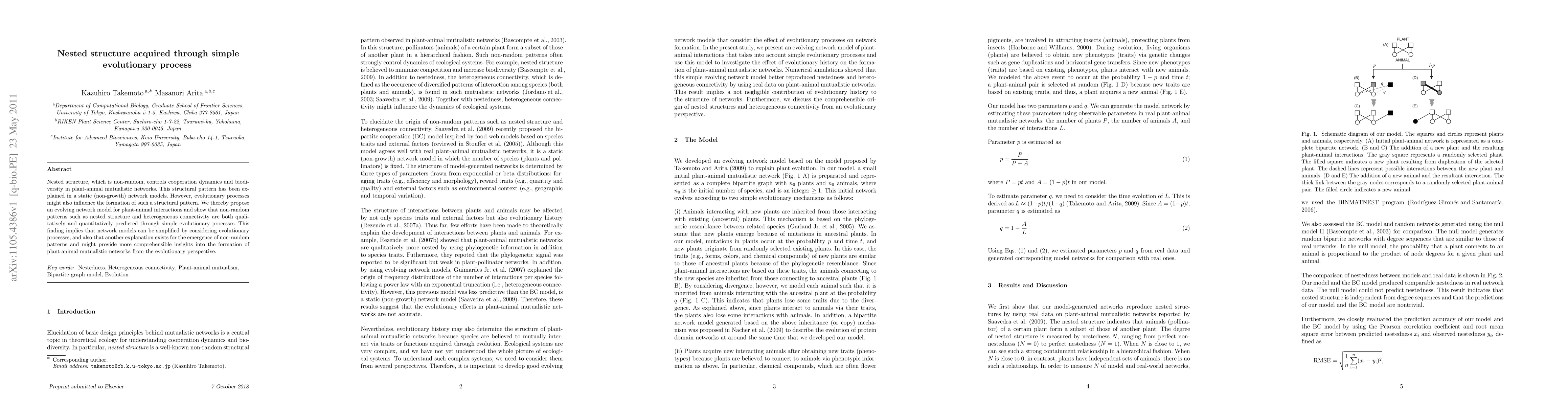 Nested structure, which is non-random, controls cooperation dynamics and biodiversity in plant-animal mutualistic networks. This structural pattern has been explained in a static (non-growth) network models. However, evolutionary processes might also influence the formation of such a structural pattern. We thereby propose an evolving network model for plant-animal interactions and show that non-random patterns such as nested structure and heterogeneous connectivity are both qualitatively and quantitatively predicted through simple evolutionary processes. This finding implies that network models can be simplified by considering evolutionary processes, and also that another explanation exists for the emergence of non-random patterns and might provide more comprehensible insights into the formation of plant-animal mutualistic networks from the evolutionary perspective.