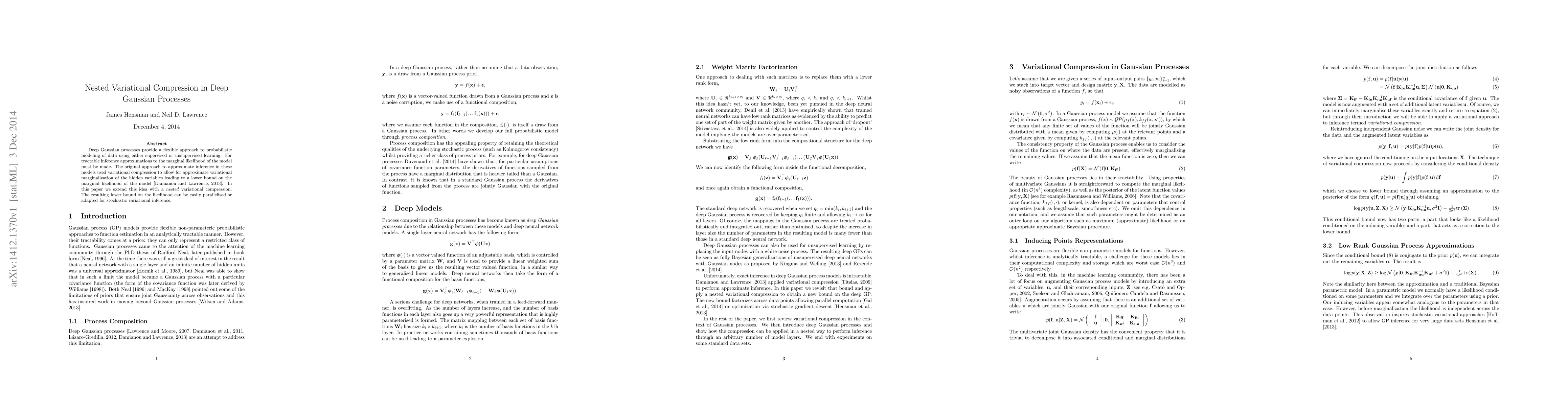 Deep Gaussian processes provide a flexible approach to probabilistic modelling of data using either supervised or unsupervised learning. For tractable inference approximations to the marginal likelihood of the model must be made. The original approach to approximate inference in these models used variational compression to allow for approximate variational marginalization of the hidden variables leading to a lower bound on the marginal likelihood of the model [Damianou and Lawrence, 2013]. In this paper we extend this idea with a nested variational compression. The resulting lower bound on the likelihood can be easily parallelized or adapted for stochastic variational inference.