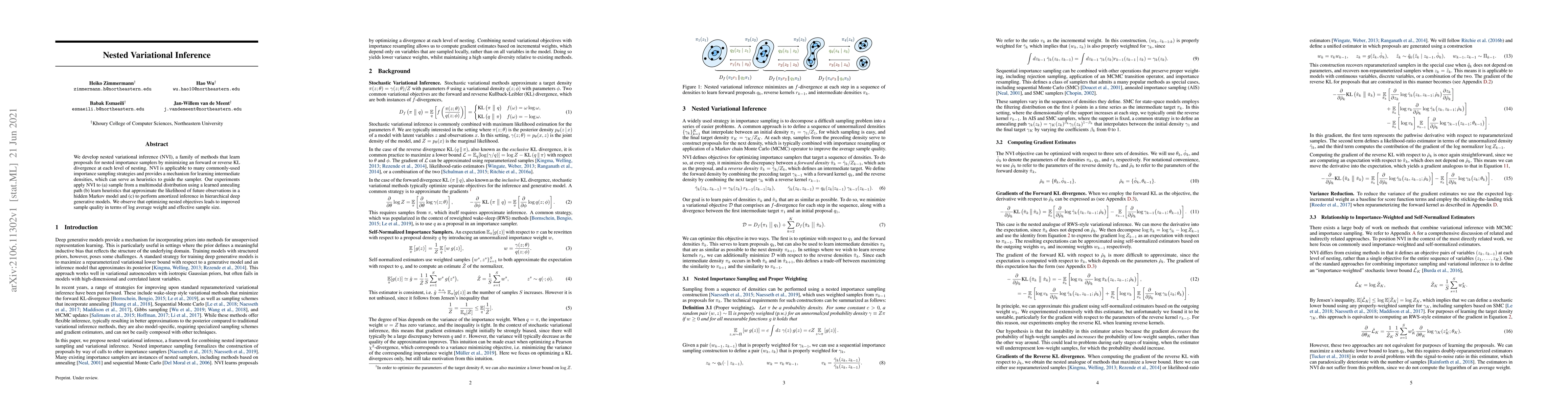 Nested variational inference (NVI) optimizes proposal distributions for nested importance samplers, enhancing sample quality through improved log average weight and effective sample size. Experiments demonstrate NVI's effectiveness in multimodal sampling, hidden Markov models, and hierarchical deep generative models.