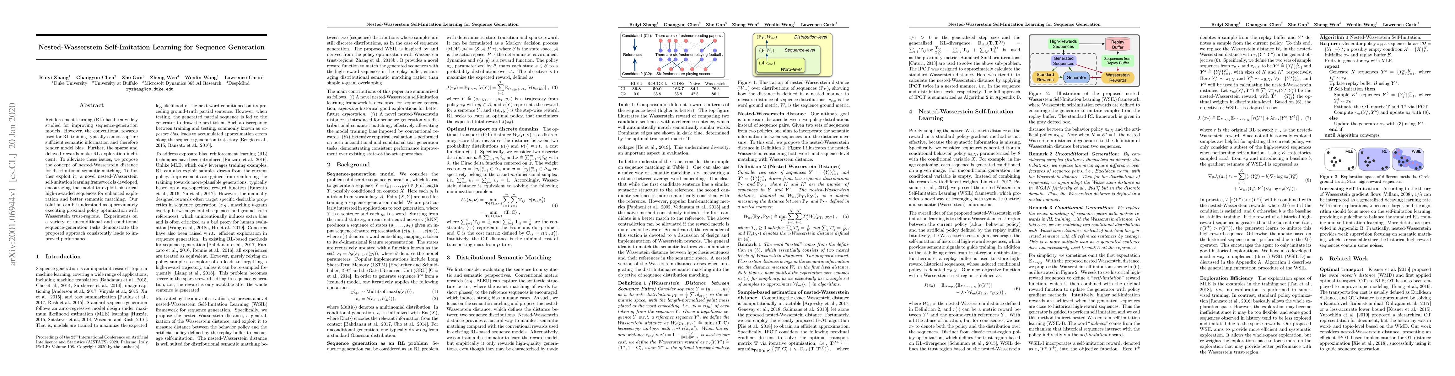 This paper proposes a nested-Wasserstein self-imitation learning framework to improve sequence-generation models in reinforcement learning by using nested-Wasserstein distance for better semantic matching and efficient exploration. The method leverages historical high-reward sequences for enhanced performance, leading to consistent improvements across various tasks.
