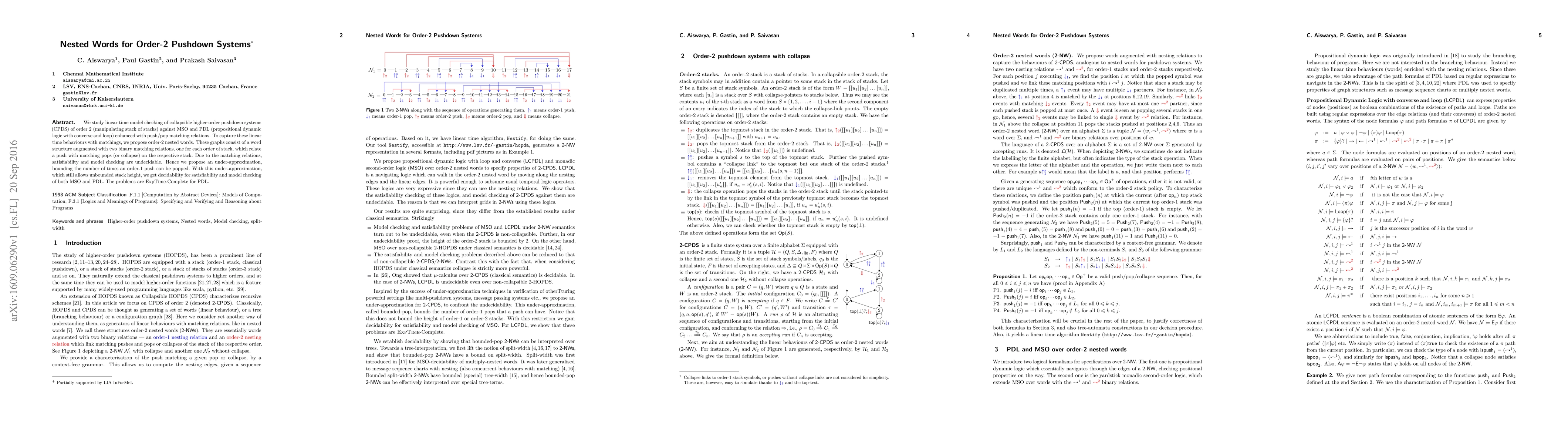 This paper proposes order-2 nested words to model linear time behaviors of higher-order pushdown systems of order 2, which involve stacks of stacks. The authors tackle the undecidability of satisfiability and model checking by introducing an under-approximation that bounds the number of order-1 pops, resulting in decidability for MSO and PDL model checking, with the PDL problem being ExpTime-complete.