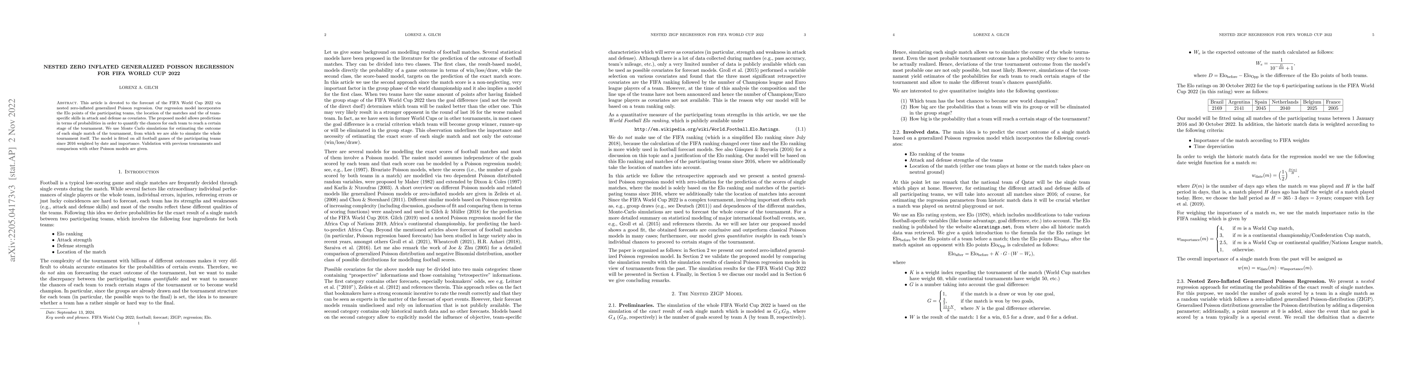 This paper proposes a nested zero-inflated generalized Poisson regression model to predict outcomes for the FIFA World Cup 2022, incorporating team Elo points, match locations, and attack/defense skills. The model uses Monte Carlo simulations to estimate match outcomes and simulate the entire tournament, validated against previous tournaments and compared with other Poisson models.