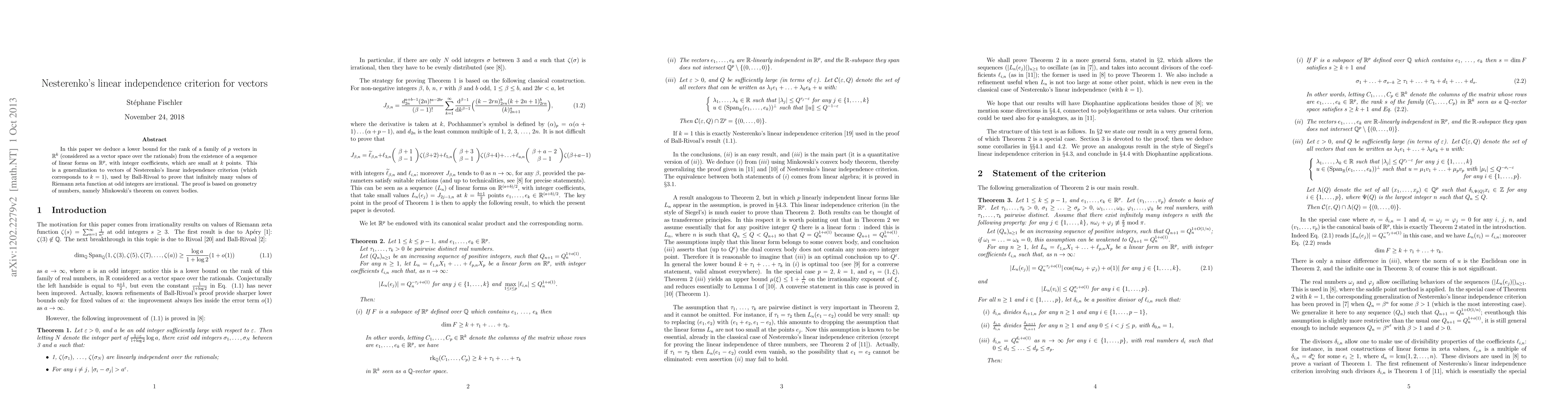 In this paper we deduce a lower bound for the rank of a family of $p$ vectors in $\R^k$ (considered as a vector space over the rationals) from the existence of a sequence of linear forms on $\R^p$, with integer coefficients, which are small at $k$ points. This is a generalization to vectors of Nesterenko's linear independence criterion (which corresponds to $k=1$), used by Ball-Rivoal to prove that infinitely many values of Riemann zeta function at odd integers are irrational. The proof is based on geometry of numbers, namely Minkowski's theorem on convex bodies.