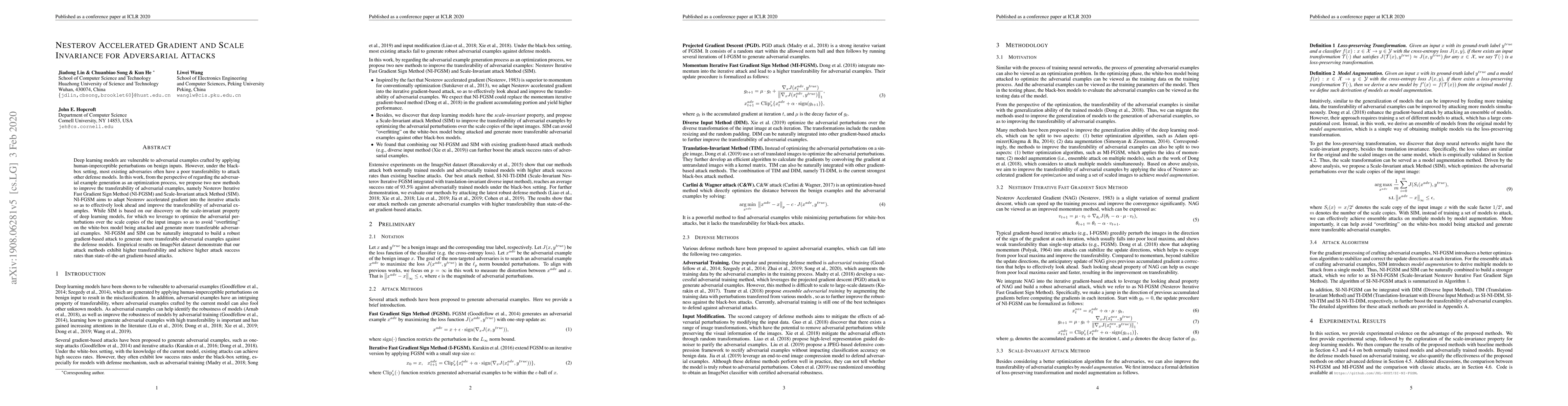 This paper proposes two new methods, Nesterov Iterative Fast Gradient Sign Method (NI-FGSM) and Scale-Invariant attack Method (SIM), to improve the transferability of adversarial examples in black-box attacks. NI-FGSM uses Nesterov accelerated gradient for better transferability, while SIM leverages scale invariance to optimize perturbations across scaled inputs, resulting in more effective adversarial attacks against defense models.