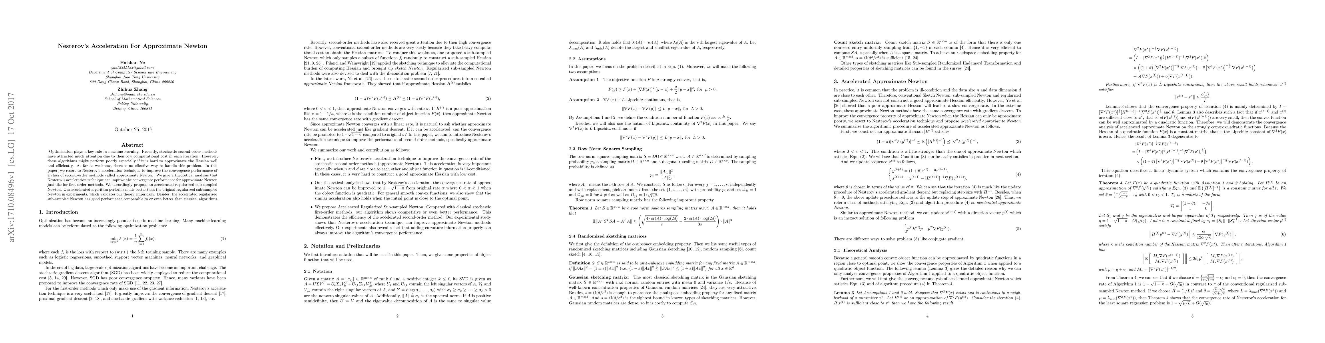 This paper proposes an accelerated version of approximate Newton methods using Nesterov's acceleration technique to improve convergence performance, especially when Hessian approximation is challenging. Theoretical analysis and empirical results show that the accelerated algorithm outperforms the original method and performs competitively against classical algorithms.