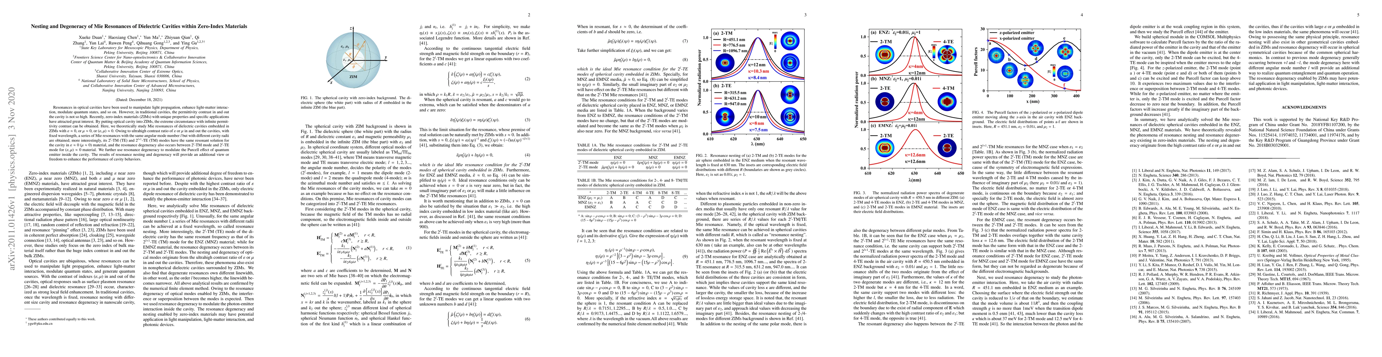 Resonances in optical cavities have been used to manipulate light propagation, enhance light-matter interaction, modulate quantum states, and so on. However, in traditional cavities, the permittivity contrast in and out the cavity is not so high. Recently, zero-index materials (ZIMs) with unique properties and specific applications have attracted great interest. By putting optical cavity into ZIMs, the extreme circumstance with infinite permittivity contrast can be obtained. Here, we theoretically study Mie resonances of dielectric cavities embedded in ZIMs with $\varepsilon \approx 0$, or $\mu \approx 0$, or $(\varepsilon,\mu) \approx 0$. Owing to ultrahigh contrast ratio of $\varepsilon$ or $\mu$ in and out the cavities, with fixed wavelength, a series of Mie resonances with the same angular mode number $l$ but with different cavity radii are obtained; more interestingly, its $2^l$-TM (TE) and $2^{l+1}$-TE (TM) modes have the same resonant solution for the cavity in $\varepsilon \approx 0$ ($\mu \approx 0$) material, and the resonance degeneracy also occurs between $2^l$-TM mode and $2^l$-TE mode for $(\varepsilon,\mu) \approx 0$ material. We further use resonance degeneracy to modulate the Purcell effect of quantum emitter inside the cavity. The results of resonance nesting and degeneracy will provide an additional view or freedom to enhance the performance of cavity behaviors.