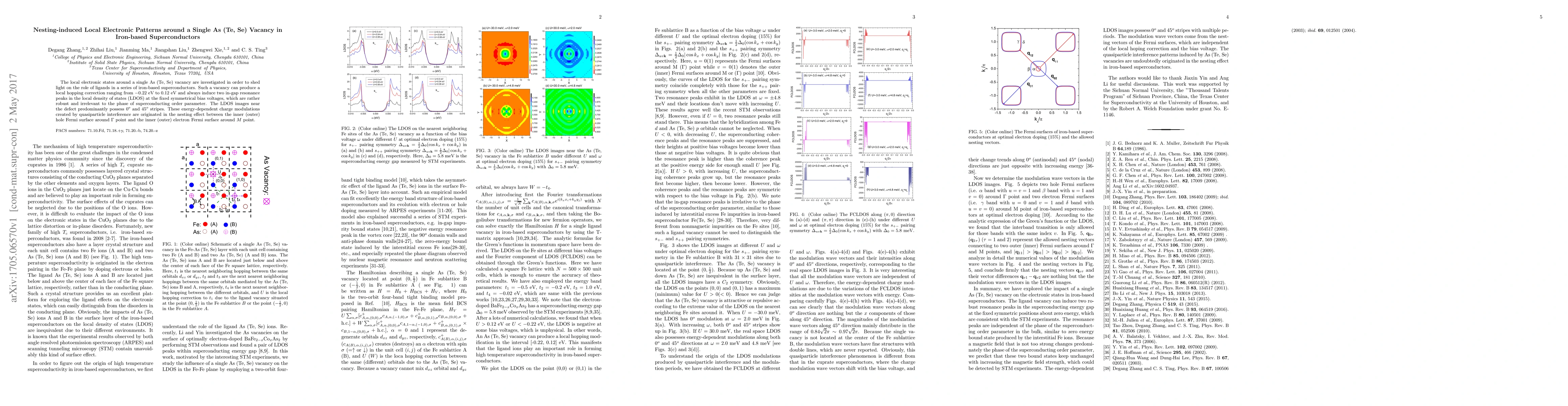 The local electronic states around a single As (Te, Se) vacancy are investigated in order to shed light on the role of ligands in a series of iron-based superconductors. Such a vacancy can produce a local hopping correction ranging from $-0.22$ eV to 0.12 eV and always induce two in-gap resonance peaks in the local density of states (LDOS) at the fixed symmetrical bias voltages, which are rather robust and irrelevant to the phase of superconducting order parameter. The LDOS images near the defect predominantly possess $0^o$ and $45^o$ stripes. These energy-dependent charge modulations created by quasiparticle interference are originated in the nesting effect between the inner (outer) hole Fermi surface around $\Gamma$ point and the inner (outer) electron Fermi surface around $M$ point.