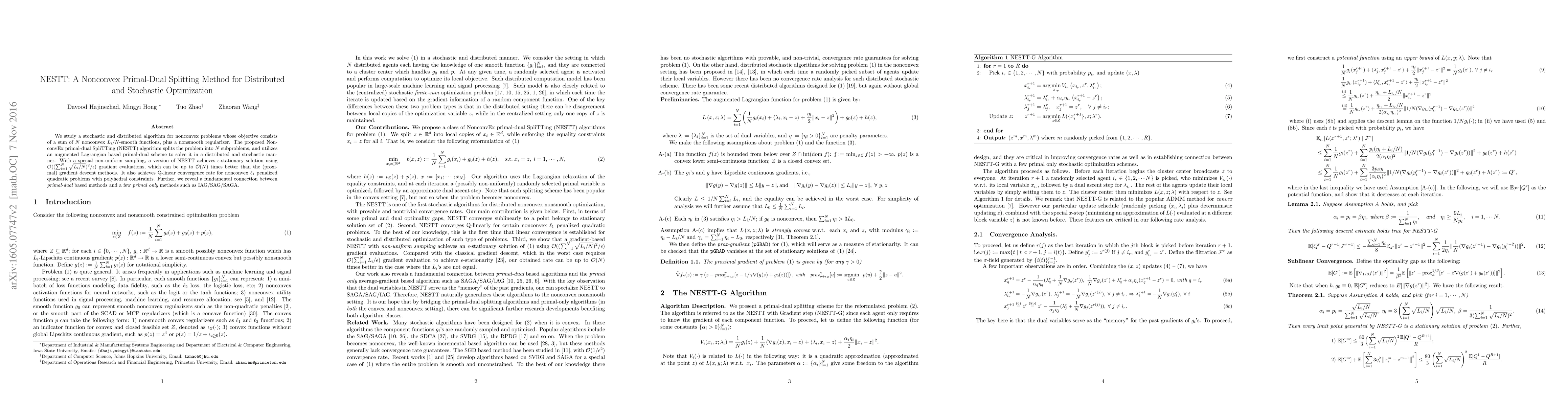 We study a stochastic and distributed algorithm for nonconvex problems whose objective consists of a sum of $N$ nonconvex $L_i/N$-smooth functions, plus a nonsmooth regularizer. The proposed NonconvEx primal-dual SpliTTing (NESTT) algorithm splits the problem into $N$ subproblems, and utilizes an augmented Lagrangian based primal-dual scheme to solve it in a distributed and stochastic manner. With a special non-uniform sampling, a version of NESTT achieves $\epsilon$-stationary solution using $\mathcal{O}((\sum_{i=1}^N\sqrt{L_i/N})^2/\epsilon)$ gradient evaluations, which can be up to $\mathcal{O}(N)$ times better than the (proximal) gradient descent methods. It also achieves Q-linear convergence rate for nonconvex $\ell_1$ penalized quadratic problems with polyhedral constraints. Further, we reveal a fundamental connection between primal-dual based methods and a few primal only methods such as IAG/SAG/SAGA.