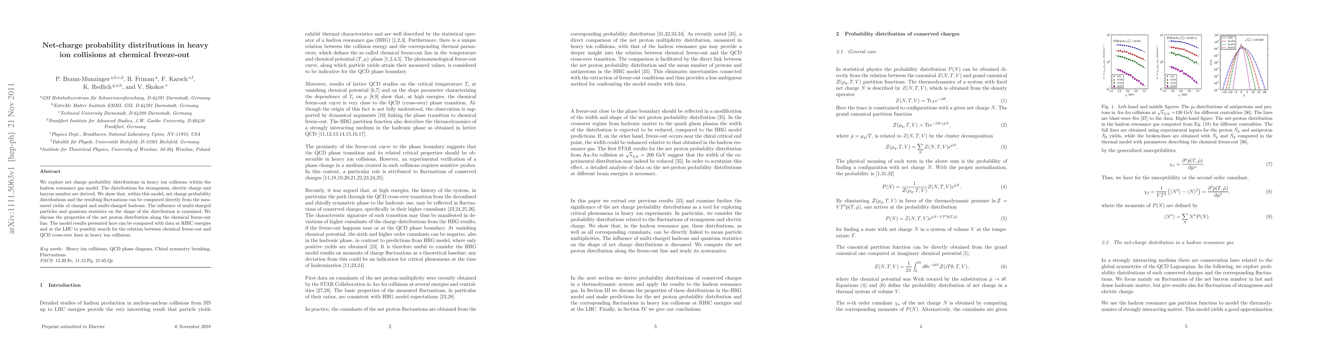 This paper investigates net charge probability distributions in heavy ion collisions using the hadron resonance gas model, deriving distributions for strangeness, electric charge, and baryon number from measured hadron yields. The study examines how multi-charged particles and quantum statistics affect these distributions and compares the model's predictions with experimental data to explore connections between chemical freeze-out and QCD cross-over lines.