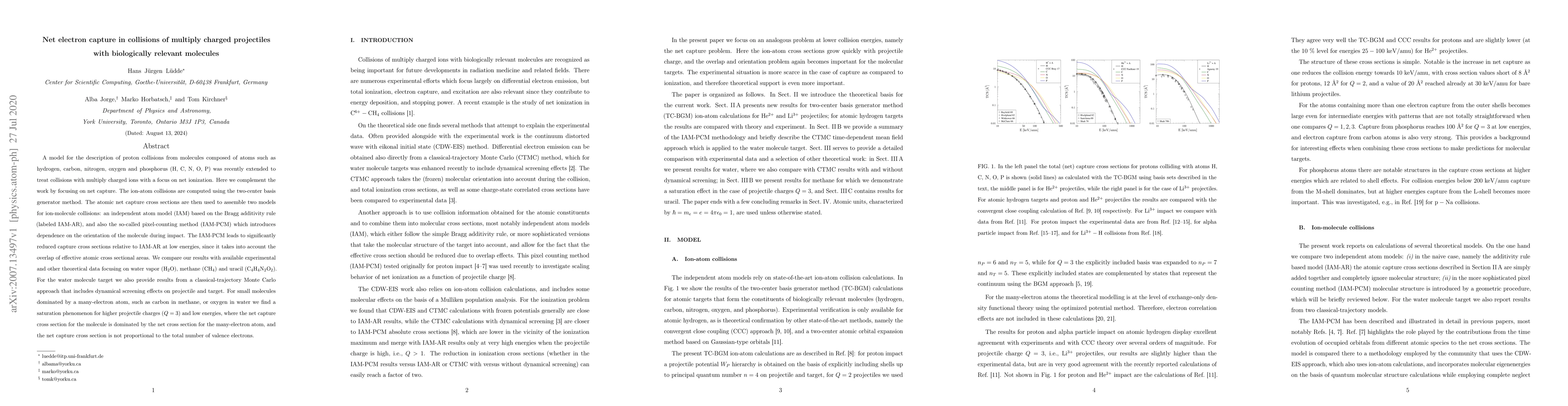 This paper extends a model to describe net electron capture in collisions between multiply charged ions and biologically relevant molecules, employing two-center basis generator methods. It introduces two models for ion-molecule collisions: an independent atom model and a pixel-counting method that accounts for molecular orientation, showing reduced capture cross sections at low energies.