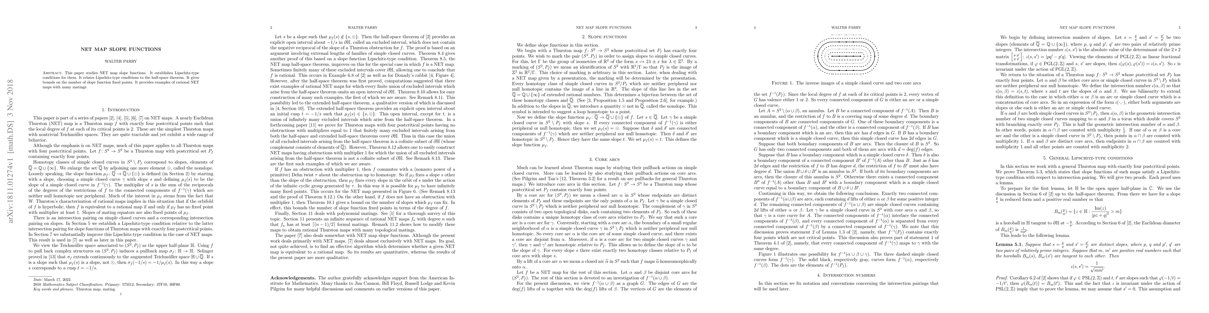This paper studies NET map slope functions. It establishes Lipschitz-type conditions for them. It relates Lipschitz-type conditions to the half-space theorem. It gives bounds on the number of slope function fixed points. It provides examples of rational NET maps with many matings.