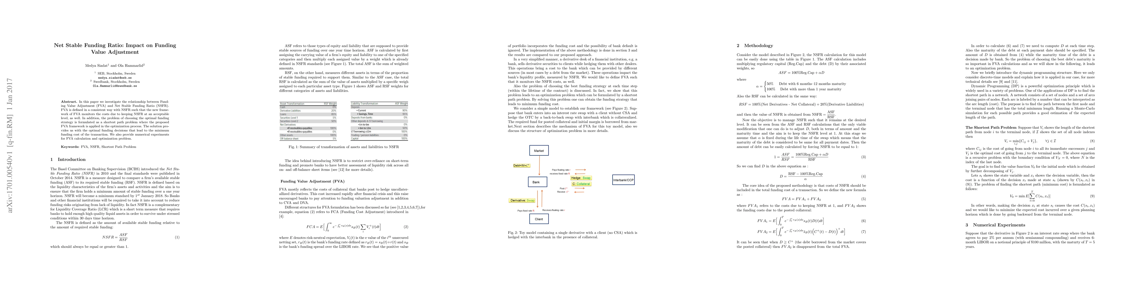 In this paper we investigate the relationship between Funding Value Adjustment (FVA) and Net Stable Funding Ratio (NSFR). FVA is defined in a consistent way with NSFR such that the new framework of FVA monitors the costs due to keeping NSFR at an acceptable level, as well. In addition, the problem of choosing the optimal funding strategy is formulated as a shortest path problem where the proposed FVA framework is applied in the optimization process. The solution provides us with the optimal funding decisions that lead to the minimum funding cost of the transaction. We also provide numerical experiments for FVA calculation and optimization problem.