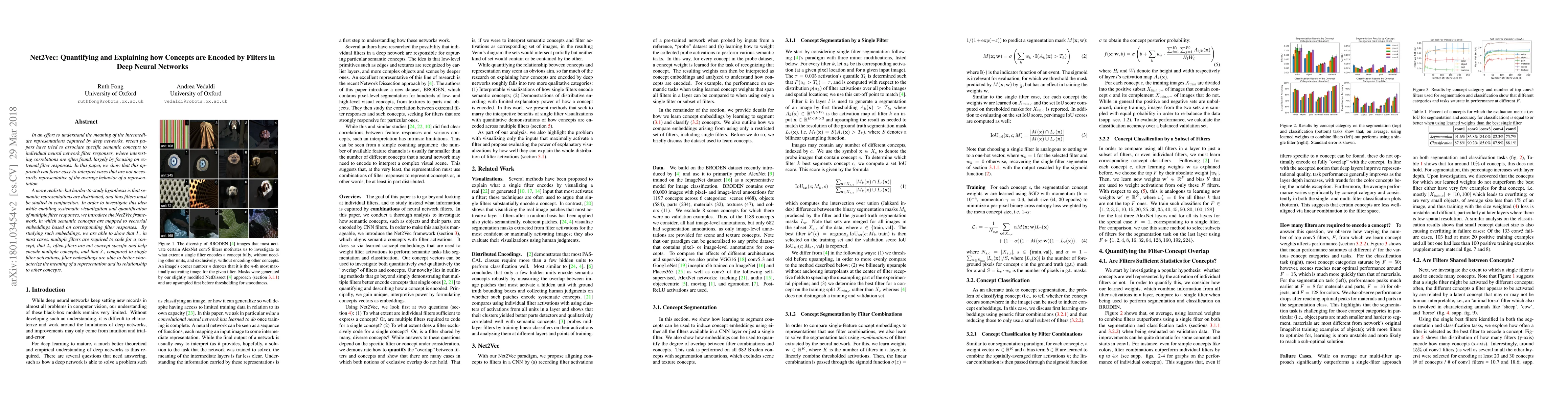 Net2Vec maps semantic concepts to vectorial embeddings based on multiple filter responses, revealing that most concepts require several filters, filters often encode multiple concepts, and these embeddings better characterize representation meanings compared to single filter activations.