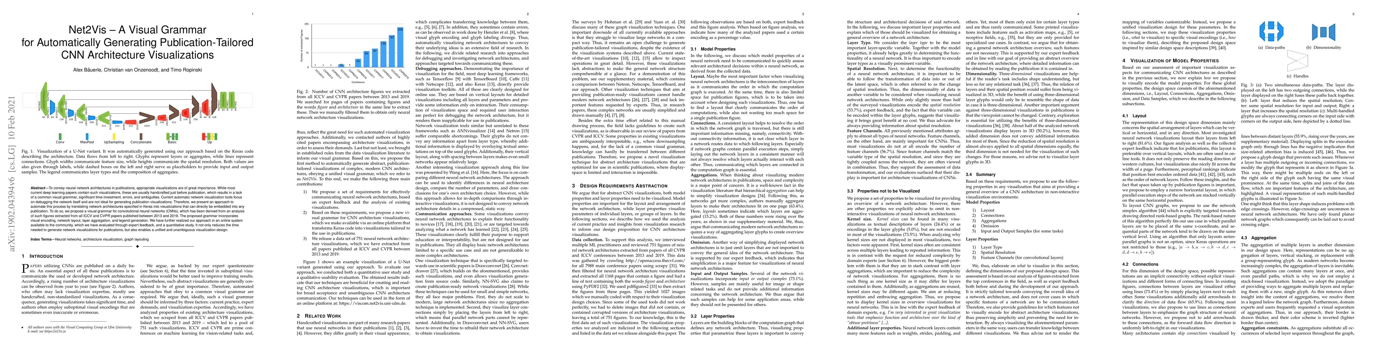 This research introduces Net2Vis, a system that automates the generation of publication-ready visualizations for convolutional neural network (CNN) architectures. By translating Keras-specified networks into standardized visualizations, the approach aims to reduce manual effort, errors, and ambiguities typically associated with handcrafted visualizations. The system is based on a visual grammar derived from analyzing CNN figures in top computer vision conference papers, ensuring consistency and clarity.