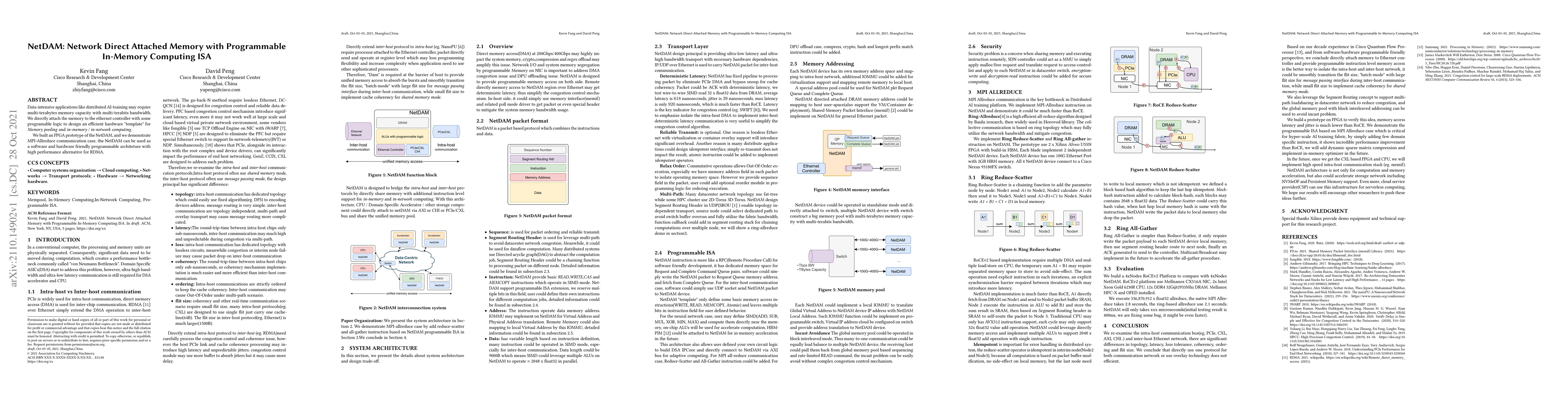 NetDAM introduces a network direct attached memory system with programmable in-memory computing, designed to meet the high memory capacity and bandwidth requirements of data-intensive applications like distributed AI-training. The prototype demonstrates its efficiency and performance as an alternative to RDMA through an FPGA implementation.
