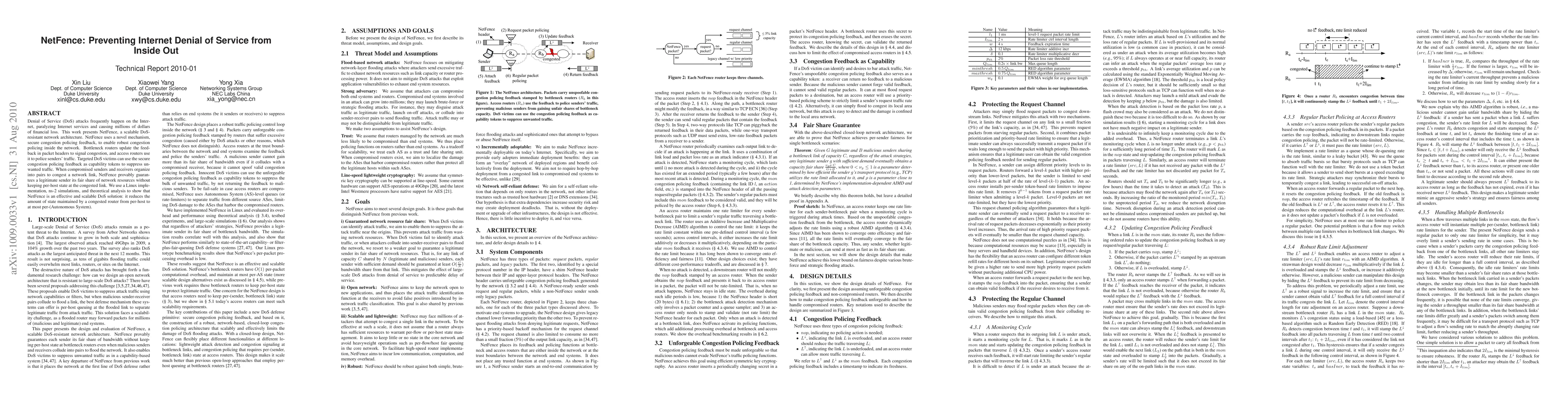 NetFence is a scalable architecture designed to prevent Denial of Service (DoS) attacks by employing secure congestion policing feedback, ensuring fair resource allocation without maintaining per-host state. It effectively reduces network congestion and financial losses caused by DoS attacks through a mechanism that pairs compromised senders and receivers.