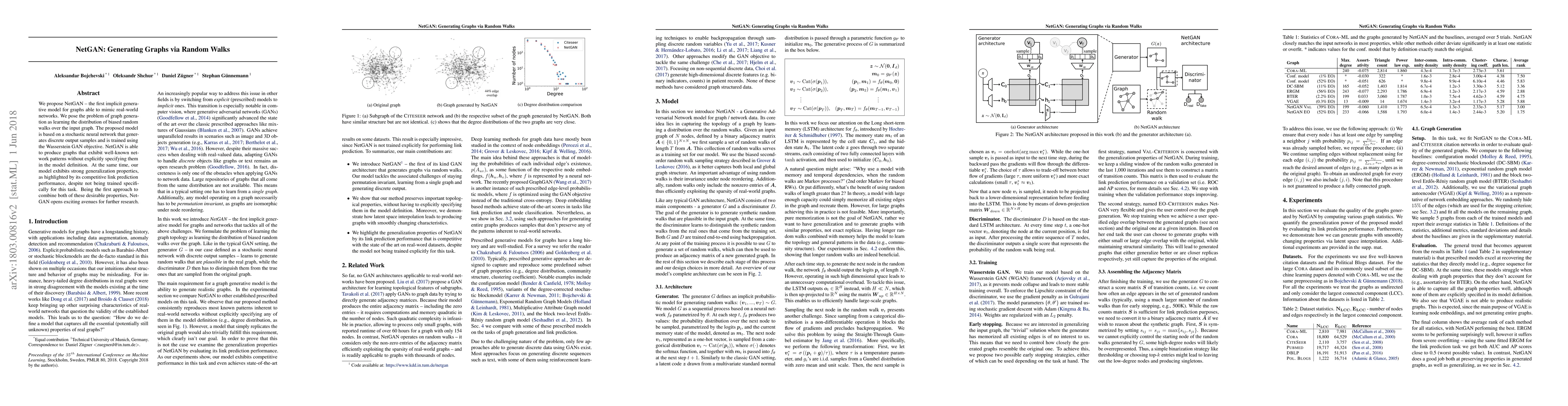 We propose NetGAN - the first implicit generative model for graphs able to mimic real-world networks. We pose the problem of graph generation as learning the distribution of biased random walks over the input graph. The proposed model is based on a stochastic neural network that generates discrete output samples and is trained using the Wasserstein GAN objective. NetGAN is able to produce graphs that exhibit well-known network patterns without explicitly specifying them in the model definition. At the same time, our model exhibits strong generalization properties, as highlighted by its competitive link prediction performance, despite not being trained specifically for this task. Being the first approach to combine both of these desirable properties, NetGAN opens exciting avenues for further research.