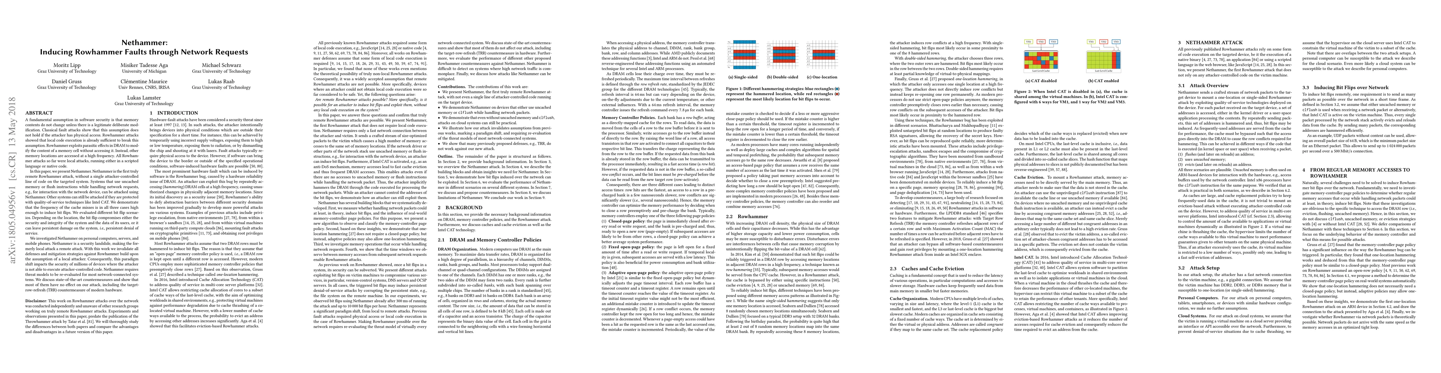 Nethammer demonstrates a remote Rowhammer attack that exploits parasitic effects in DRAM through network requests, compromising systems without requiring local code execution. This attack can induce bit flips, leading to security and integrity breaches or persistent denial of service, marking a significant advancement in remote memory corruption vulnerabilities.