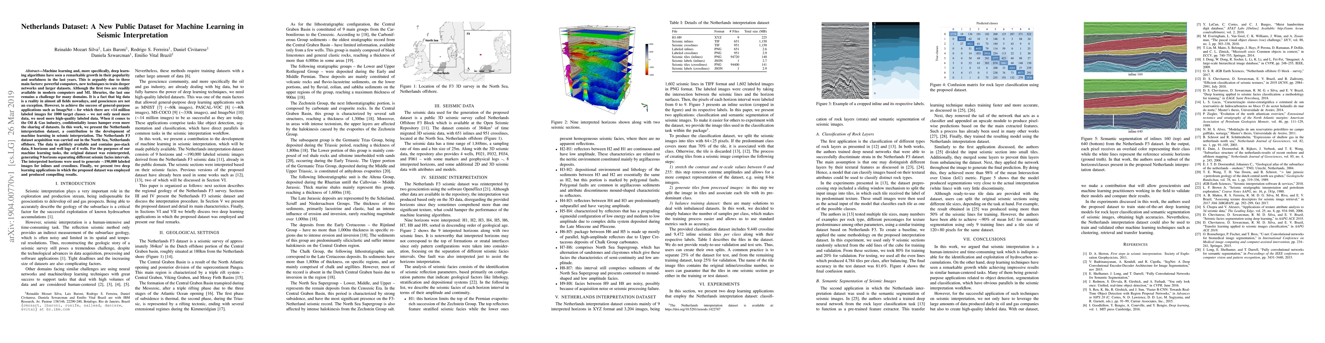 Machine learning and, more specifically, deep learning algorithms have seen remarkable growth in their popularity and usefulness in the last years. This is arguably due to three main factors: powerful computers, new techniques to train deeper networks and larger datasets. Although the first two are readily available in modern computers and ML libraries, the last one remains a challenge for many domains. It is a fact that big data is a reality in almost all fields nowadays, and geosciences are not an exception. However, to achieve the success of general-purpose applications such as ImageNet - for which there are +14 million labeled images for 1000 target classes - we not only need more data, we need more high-quality labeled data. When it comes to the Oil&Gas industry, confidentiality issues hamper even more the sharing of datasets. In this work, we present the Netherlands interpretation dataset, a contribution to the development of machine learning in seismic interpretation. The Netherlands F3 dataset acquisition was carried out in the North Sea, Netherlands offshore. The data is publicly available and contains pos-stack data, 8 horizons and well logs of 4 wells. For the purposes of our machine learning tasks, the original dataset was reinterpreted, generating 9 horizons separating different seismic facies intervals. The interpreted horizons were used to generate approximatelly 190,000 labeled images for inlines and crosslines. Finally, we present two deep learning applications in which the proposed dataset was employed and produced compelling results.