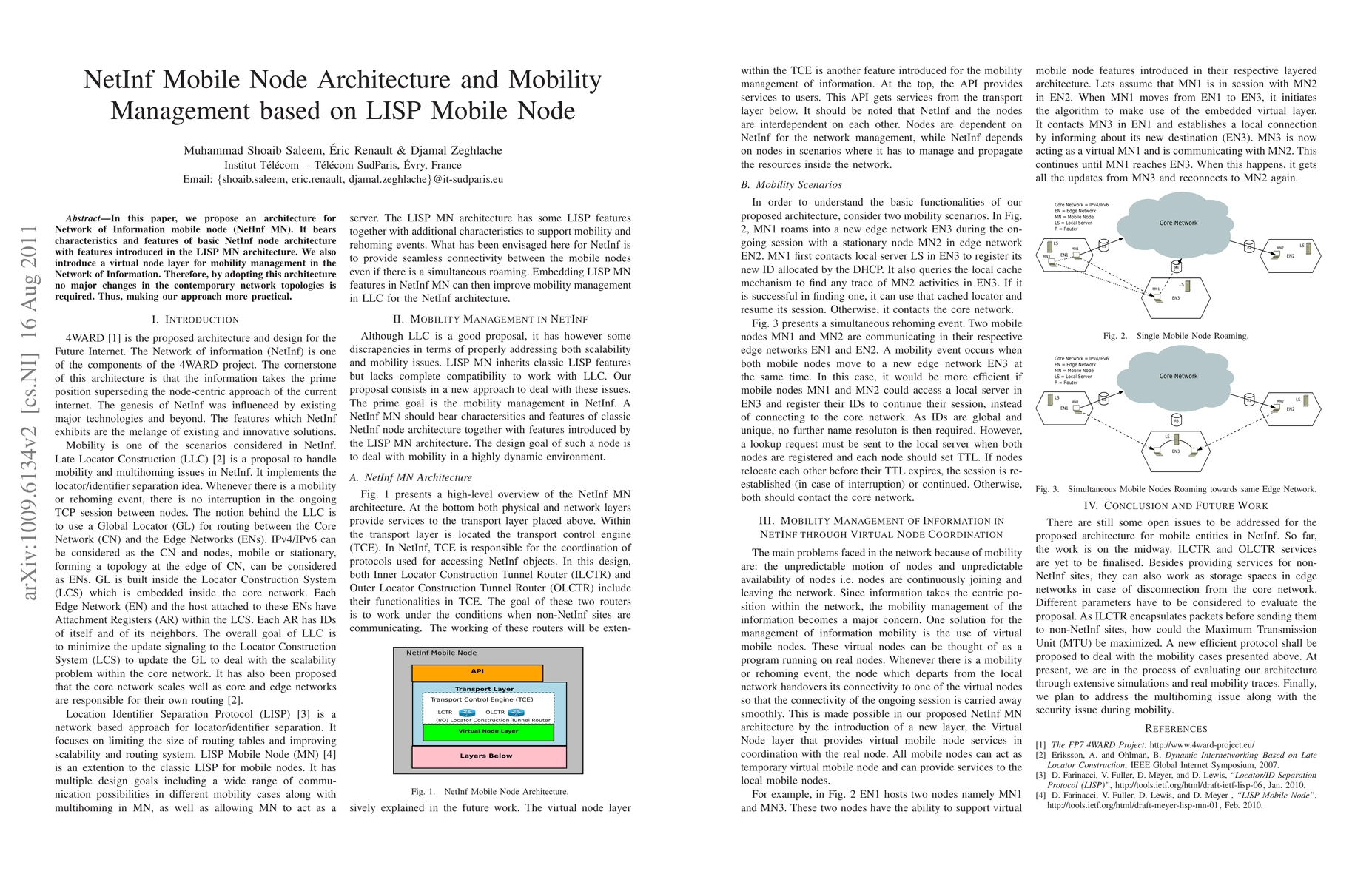 This paper proposes a NetInf Mobile Node Architecture that combines features of LISP with the existing Network of Information architecture, introducing a virtual node layer for mobility management without altering network topologies.