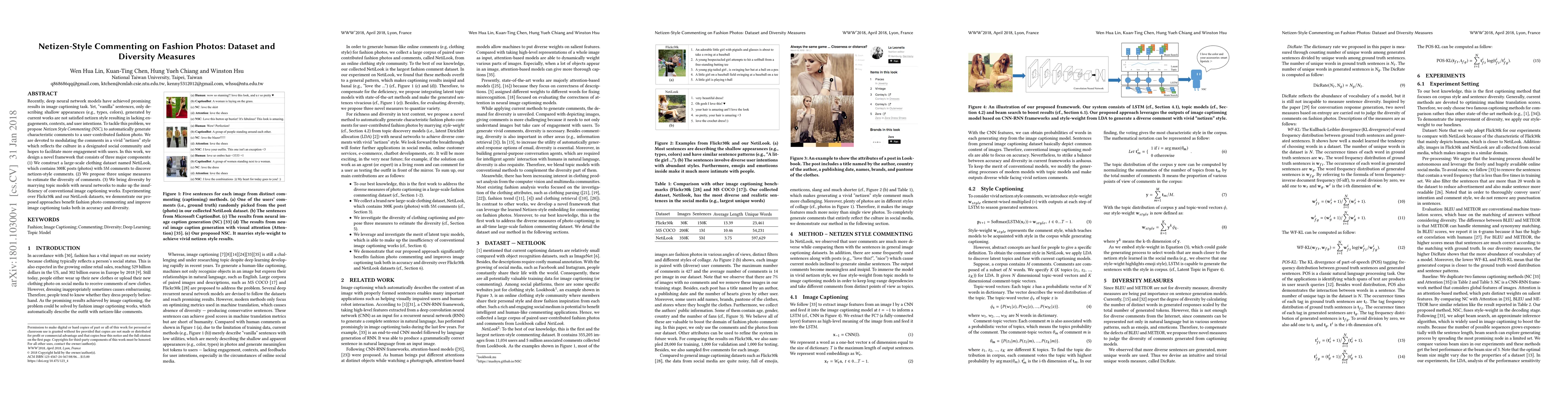 Recently, deep neural network models have achieved promising results in image captioning task. Yet, "vanilla" sentences, only describing shallow appearances (e.g., types, colors), generated by current works are not satisfied netizen style resulting in lacking engagements, contexts, and user intentions. To tackle this problem, we propose Netizen Style Commenting (NSC), to automatically generate characteristic comments to a user-contributed fashion photo. We are devoted to modulating the comments in a vivid "netizen" style which reflects the culture in a designated social community and hopes to facilitate more engagement with users. In this work, we design a novel framework that consists of three major components: (1) We construct a large-scale clothing dataset named NetiLook, which contains 300K posts (photos) with 5M comments to discover netizen-style comments. (2) We propose three unique measures to estimate the diversity of comments. (3) We bring diversity by marrying topic models with neural networks to make up the insufficiency of conventional image captioning works. Experimenting over Flickr30k and our NetiLook datasets, we demonstrate our proposed approaches benefit fashion photo commenting and improve image captioning tasks both in accuracy and diversity.