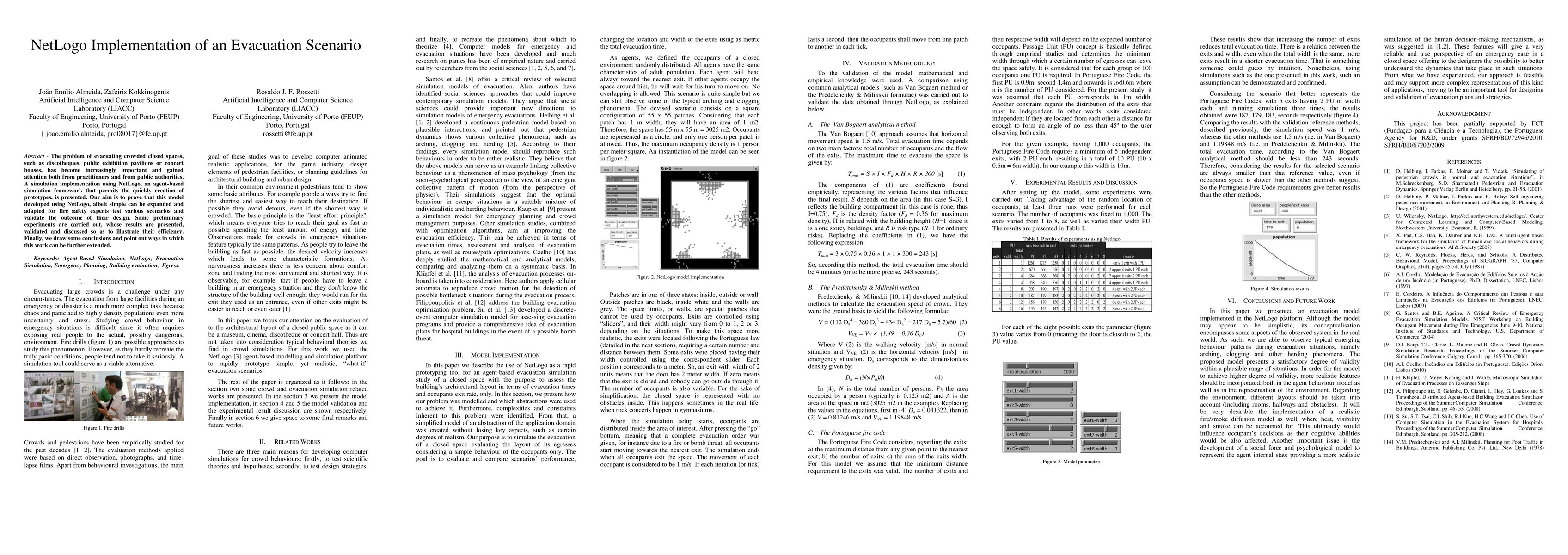 The problem of evacuating crowded closed spaces, such as discotheques, public exhibition pavilions or concert houses, has become increasingly important and gained attention both from practitioners and from public authorities. A simulation implementation using NetLogo, an agent-based simulation framework that permits the quickly creation of prototypes, is presented. Our aim is to prove that this model developed using NetLogo, albeit simple can be expanded and adapted for fire safety experts test various scenarios and validate the outcome of their design. Some preliminary experiments are carried out, whose results are presented, validated and discussed so as to illustrate their efficiency. Finally, we draw some conclusions and point out ways in which this work can be further extended.