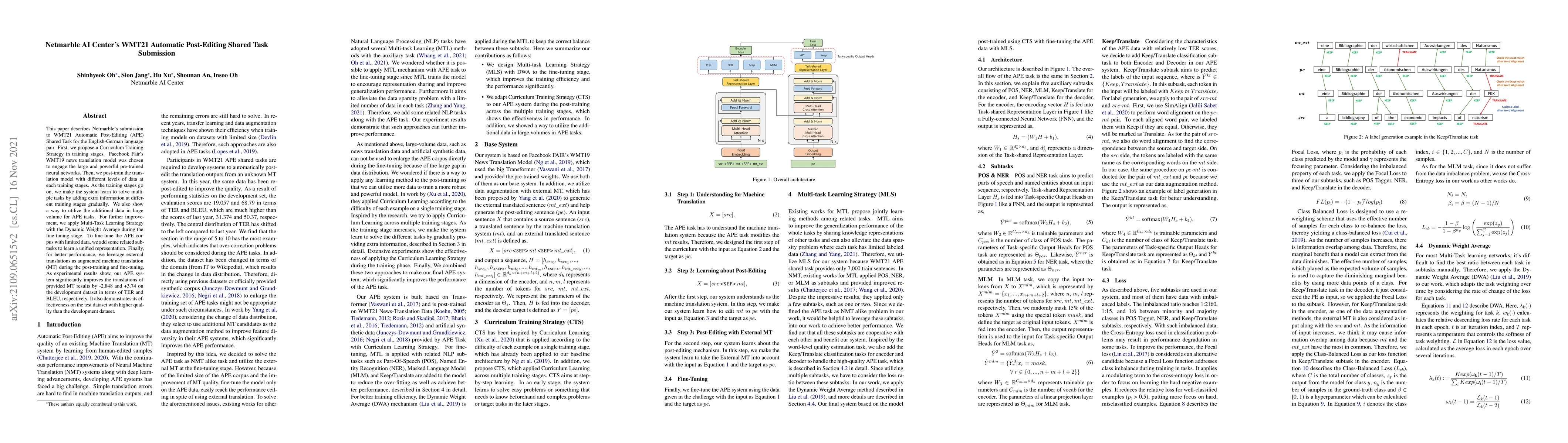 Netmarble's submission to the WMT21 Automatic Post-Editing Shared Task for English-German employs a Curriculum Training Strategy and Multi-Task Learning to enhance a pre-trained neural translation model, achieving notable improvements in translation quality as evidenced by TER and BLEU scores.