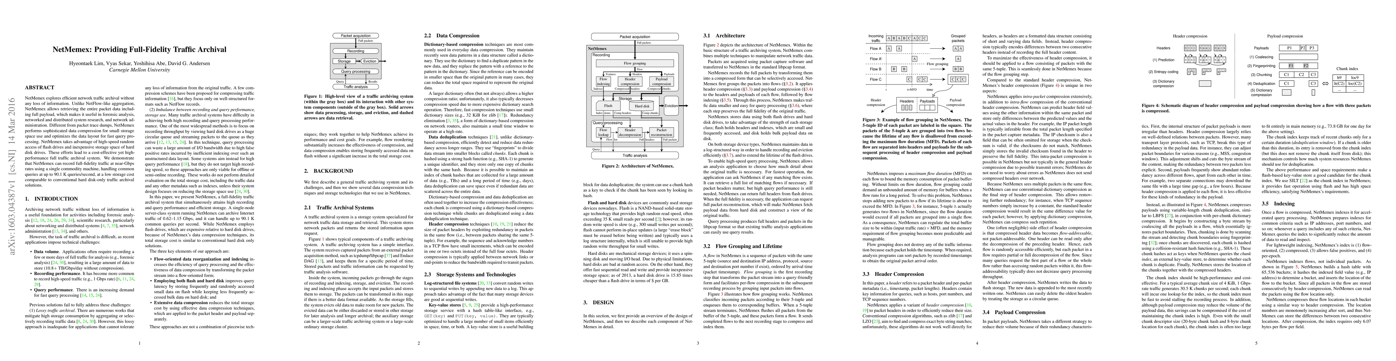 NetMemex explores efficient network traffic archival without any loss of information. Unlike NetFlow-like aggregation, NetMemex allows retrieving the entire packet data including full payload, which makes it useful in forensic analysis, networked and distributed system research, and network administration. Different from packet trace dumps, NetMemex performs sophisticated data compression for small storage space use and optimizes the data layout for fast query processing. NetMemex takes advantage of high-speed random access of flash drives and inexpensive storage space of hard disk drives. These efforts lead to a cost-effective yet high-performance full traffic archival system. We demonstrate that NetMemex can record full-fidelity traffic at near-Gbps rates using a single commodity machine, handling common queries at up to 90.1 K queries/second, at a low storage cost comparable to conventional hard disk-only traffic archival solutions.