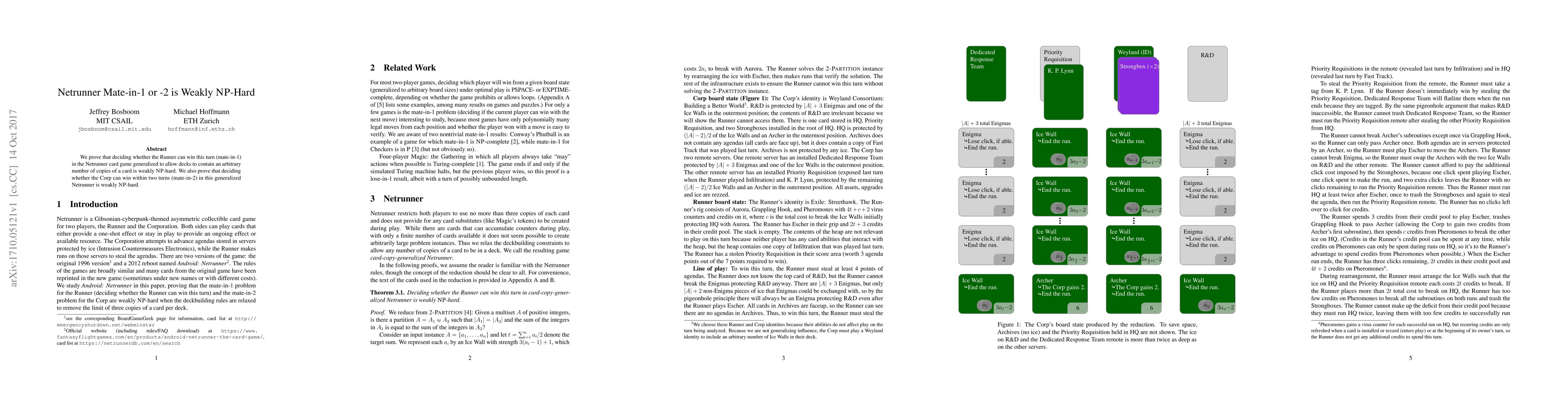 This paper demonstrates that determining if the Runner can win immediately (mate-in-1) or within two turns (mate-in-2) in a generalized Netrunner card game, where decks can contain multiple copies of cards, is weakly NP-hard. This complexity arises from the intricate strategies and potential moves in the game.
