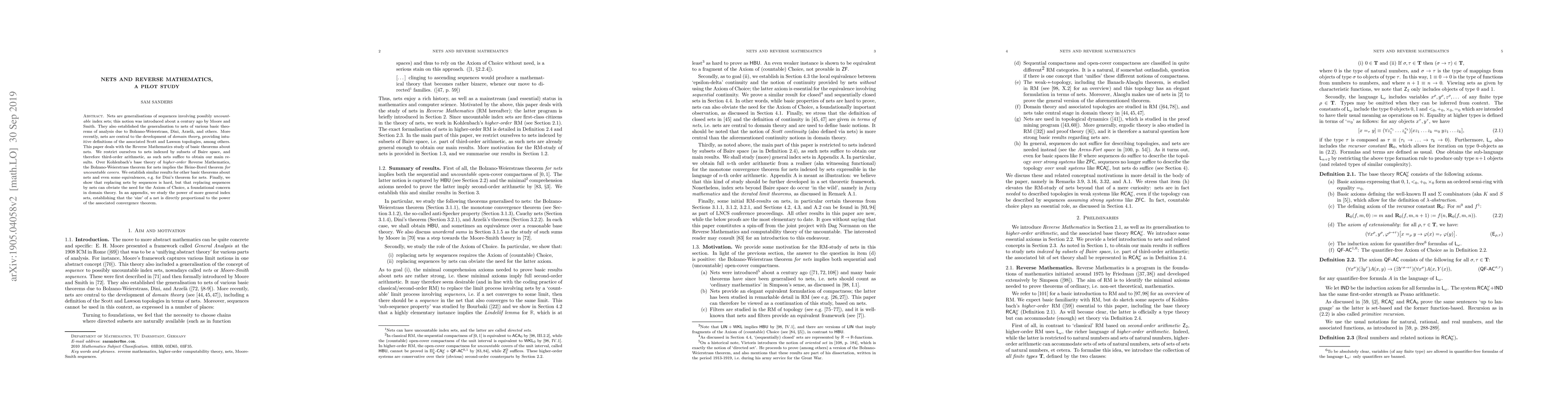 Nets are generalisations of sequences involving possibly uncountable index sets; this notion was introduced about a century ago by Moore and Smith. They also established the generalisation to nets of various basic theorems of analysis due to Bolzano-Weierstrass, Dini, Arzela, and others. More recently, nets are central to the development of domain theory, providing intuitive definitions of the associated Scott and Lawson topologies, among others. This paper deals with the Reverse Mathematics study of basic theorems about nets. We restrict ourselves to nets indexed by subsets of Baire space, and therefore third-order arithmetic, as such nets suffice to obtain our main results. Over Kohlenbach's base theory of higher-order Reverse Mathematics, the Bolzano-Weierstrass theorem for nets implies the Heine-Borel theorem for uncountable covers. We establish similar results for other basic theorems about nets and even some equivalences, e.g. for Dini's theorem for nets. Finally, we show that replacing nets by sequences is hard, but that replacing sequences by nets can obviate the need for the Axiom of Choice, a foundational concern in domain theory. In an appendix, we study the power of more general index sets, establishing that the 'size' of a net is directly proportional to the power of the associated convergence theorem.
